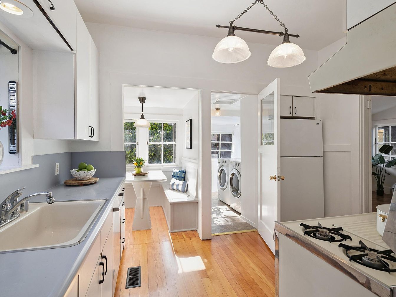 A bright galley kitchen features white cabinetry, sleek gray countertops, and warm honey-toned wood floors. A vintage gas stove and deep basin sink frame one side, while pendant lighting hangs overhead. Through an open doorway lies a cozy breakfast nook with built-in bench seating adorned with striped blue and white cushions, centered around a classic pedestal table. Large windows fill the space with natural light, and potted plants add a touch of freshness. Beyond the nook, a compact laundry area is visible with side-by-side washer and dryer units. The entire scene feels airy, welcoming, and timelessly charming.