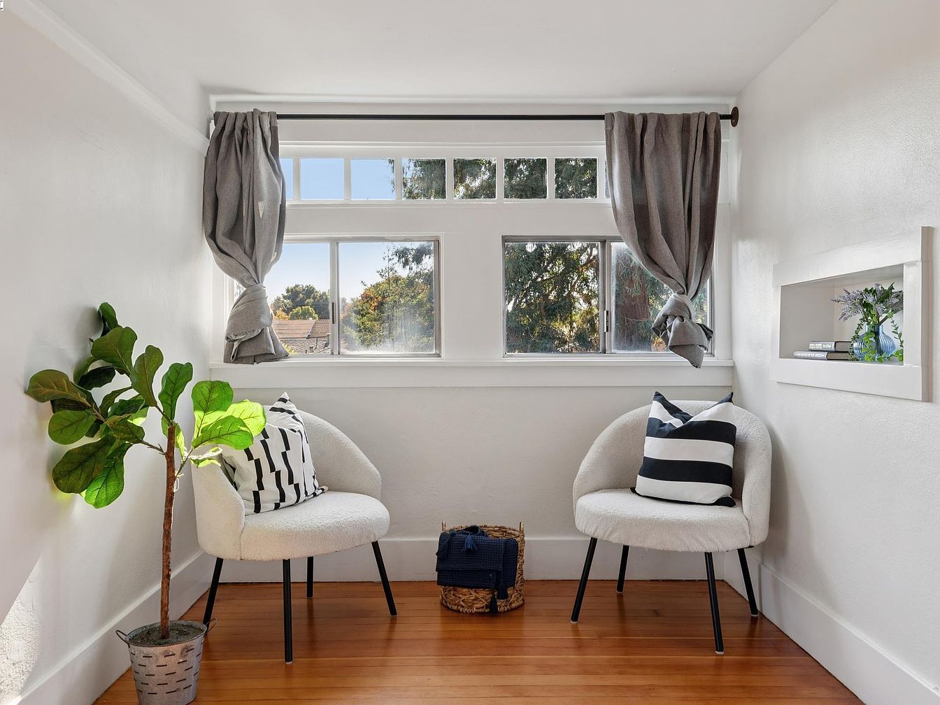 A cozy corner is set up by a large window with divided panes that lets in abundant sunlight, creating a bright and welcoming space. Two plush white chairs with black metal legs are arranged facing each other, each topped with a modern decorative pillow—one with bold black and white stripes, and the other with a geometric black pattern. The light hardwood floor adds warmth, while a woven basket and a small potted fiddle-leaf fig plant sit between the chairs. Soft gray curtains are tied back on either side, and a recessed wall shelf displays a small vase with flowers and a few stacked books.