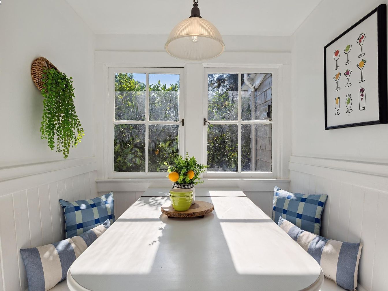 A sunlit breakfast nook features white-painted wood-paneled walls and built-in bench seating on both sides of a rectangular table. The benches are topped with cushions and pillows in blue plaid and striped patterns, adding a cozy, inviting atmosphere. Large windows at the end of the space allow natural light to pour in, creating bright reflections across the white surfaces. Above, a simple pendant light with a ribbed shade provides additional illumination. Wall décor includes a woven planter with a trailing green plant and a framed print of various colorful cocktails, contributing a cheerful yet classic aesthetic.