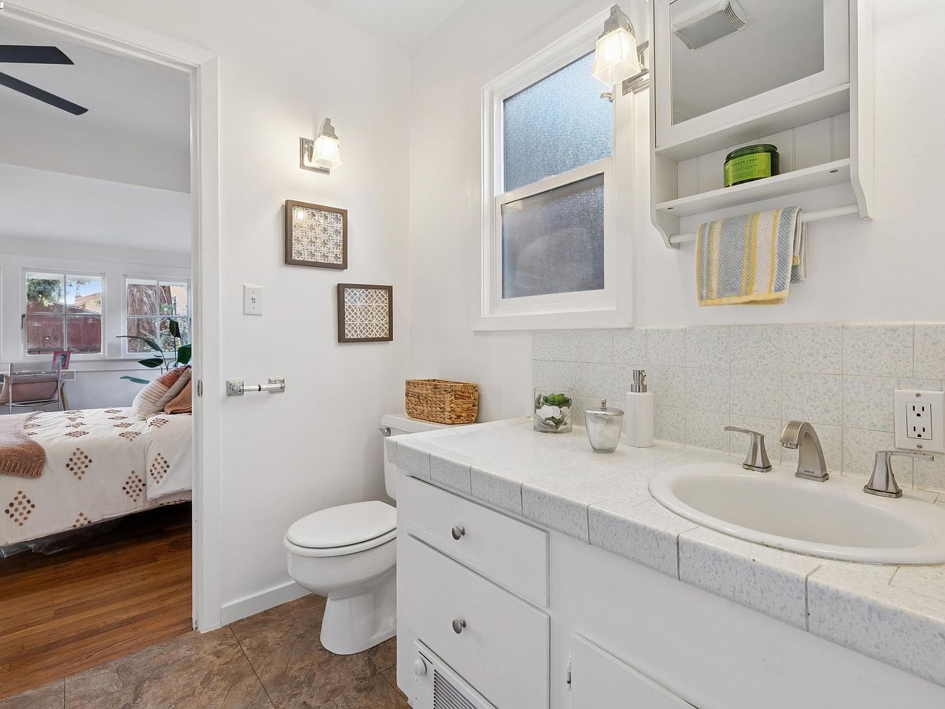 A compact bathroom with white walls and light-colored tile countertops connects directly to a bedroom visible through an open doorway. The vanity features a simple countertop with a built-in sink, brushed nickel faucet, and minimal decor including a small plant, soap dispenser, and a wicker basket resting atop the toilet tank. Above the sink, a wall-mounted mirrored cabinet with a shelf and towel bar is seen, with subtle lighting from twin sconce fixtures. Soft beige tile flooring grounds the room. Visible through the doorway, the bedroom showcases a cozy bed, soft natural lighting, wooden floors, and a view of multiple windows.