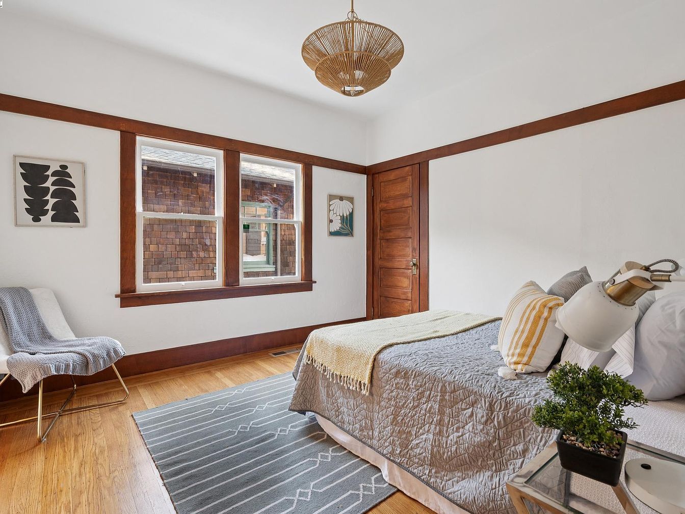 A cozy bedroom filled with natural light from three large rectangular windows on one wall, bordered in rich, dark wood trim that contrasts against soft white walls. The wooden floor is covered by a stylish gray area rug with white geometric patterns, providing a warm base for the neatly made bed positioned under the windows. The bedding features muted grays and soft yellows, adding warmth and texture. A mid-century modern chair sits in the corner draped with a gray throw, while a glass-topped nightstand holds a potted plant and a retro white lamp. Simple, modern art hangs on the walls, completing the serene setting.