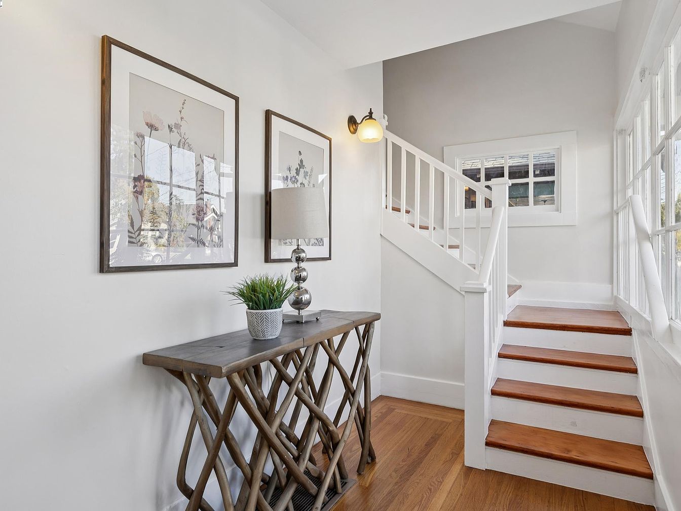 At the entrance, warm wood floors contrast with crisp white walls, creating an airy atmosphere. A unique wooden console table stands against one wall, topped with a modern silver lamp and a small green plant. Above the table, two large botanical prints in minimalist frames add a touch of nature-inspired elegance. The staircase features white rails and natural wood treads, turning at a right angle near a window that fills the area with soft, natural light. The overall ambiance is inviting, blending traditional charm with modern simplicity and emphasizing openness and light throughout the space.