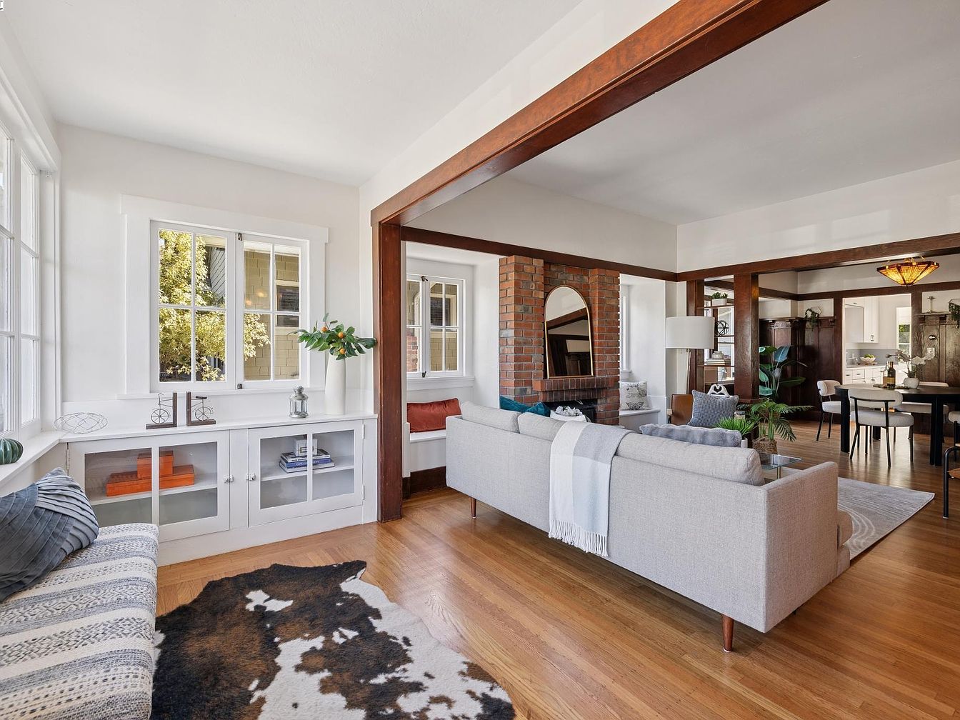 A bright, open-concept living room with abundant natural light from large, gridded windows. Crisp white walls are accented by wide, warm-toned wooden beams that frame the space and connect it to the dining area in the background. The room features a light gray, contemporary L-shaped sofa centered on a pale area rug and facing a brick fireplace with an arched mirror above. Built-in white cabinetry with glass doors lines the windowed wall, displaying books and decorative accents. Hardwood floors and a cowhide rug complete the warm, inviting atmosphere, while touches of greenery and modern décor soften the historical architectural elements.