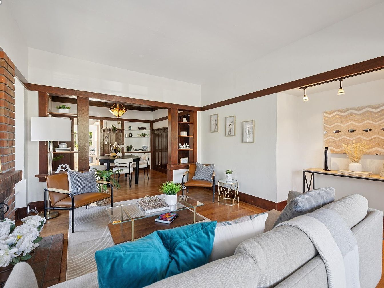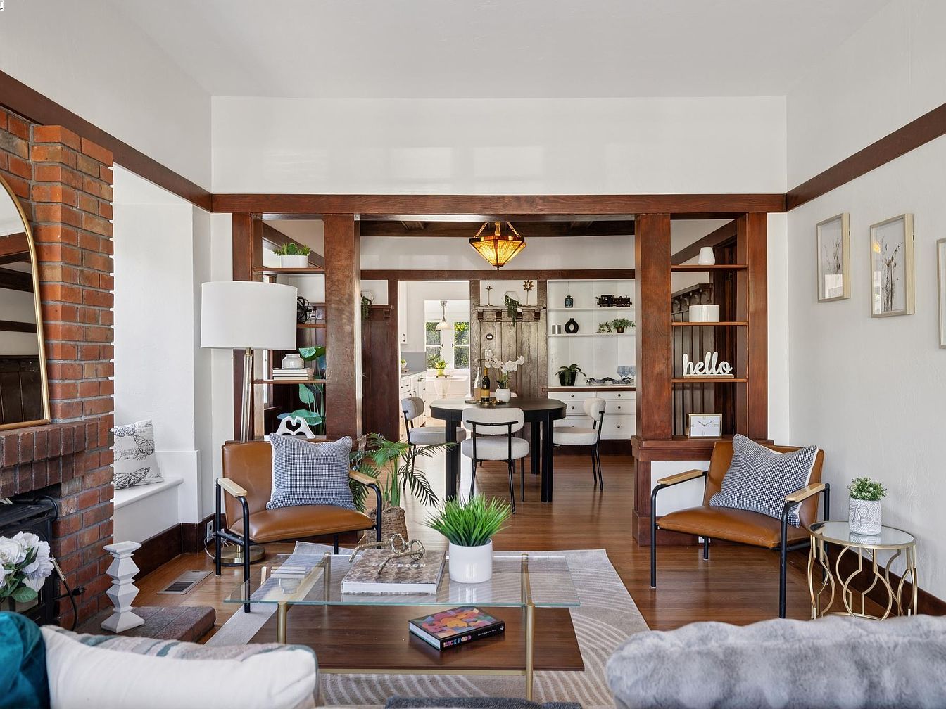 Warm and inviting living area with an open layout leading into the dining space. Rich, dark wood trim frames the entry between rooms and creates built-in shelving for books and decorative objects. Comfortable armchairs with tan leather seats and textured throw pillows face a central glass coffee table, which holds books, a plant, and decorative trays. The room features a brick fireplace on the left, a white floor lamp, and accents of gold in the decor and furniture legs. Soft white walls, wooden floors, and contemporary art provide a blend of Craftsman charm and modern style, accented with greenery and natural light.