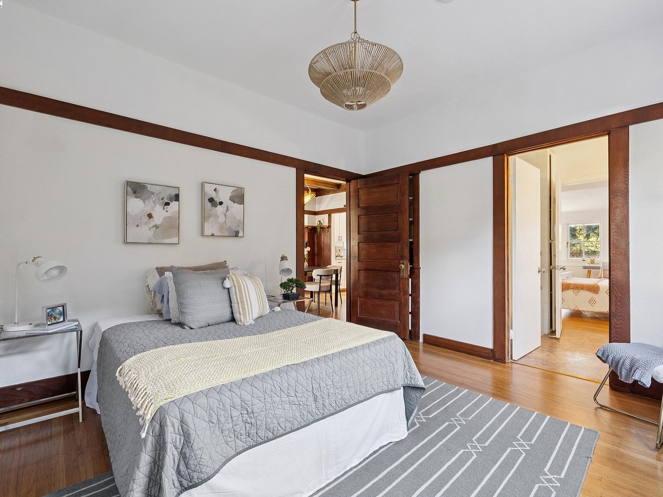 A spacious bedroom with high ceilings, defined by crisp white walls and wide wooden trim around doors and floor. The centerpiece is a bed dressed in a gray quilt and pillows of gray and cream, accented by a pale yellow throw blanket. Two abstract paintings hang above the bed. On one side, a white metal nightstand holds a lamp and framed photograph. The wooden doorways lead to a hallway and a glimpse into another well-lit room with a bed. The hardwood floor sports a geometric gray area rug. The natural light complements the neutral color palette and vintage light fixture overhead.