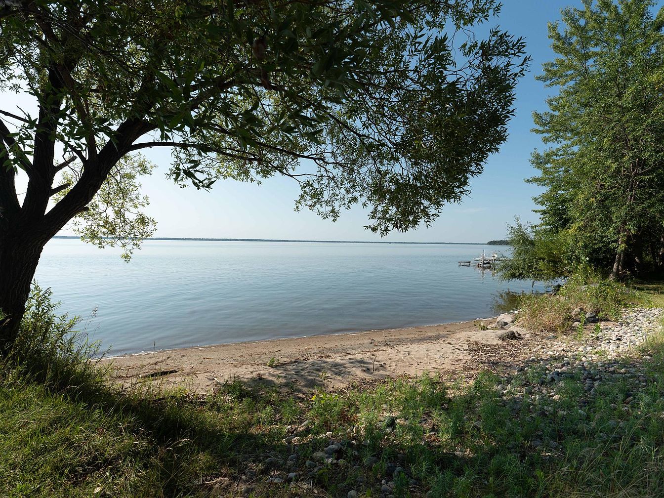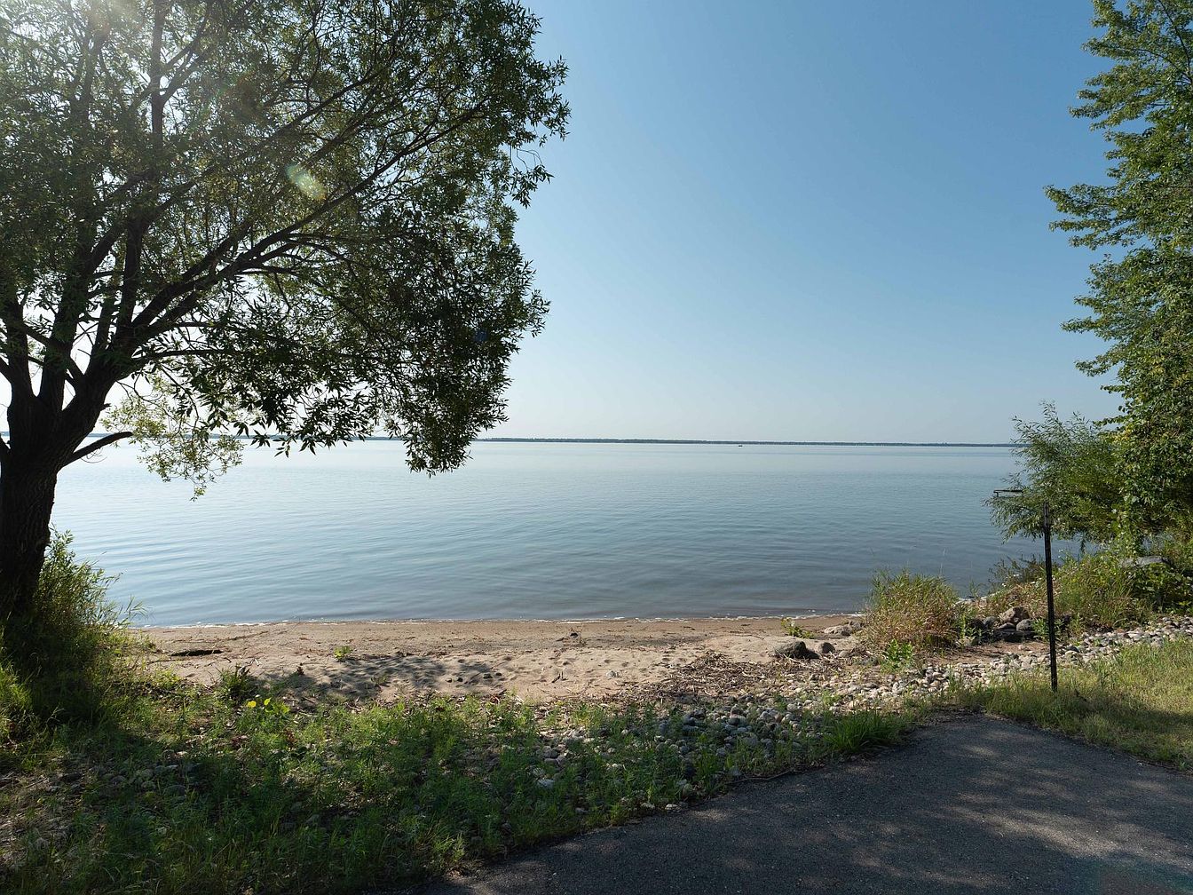 A tranquil backyard space opens directly onto a private sandy lakeshore, offering unobstructed views of calm water beneath a clear blue sky. Shaded by mature leafy trees, the area features a blend of natural landscaping with lush grass, pebbled edges, and wild greenery, creating an inviting family-friendly retreat. The gentle slope from a paved path to the water’s edge ensures easy access for children to play, launch kayaks, or simply enjoy nature. With no barriers between the yard and the lake, the peaceful, open setting is perfect for outdoor gatherings, summer picnics, and making family memories by the water.