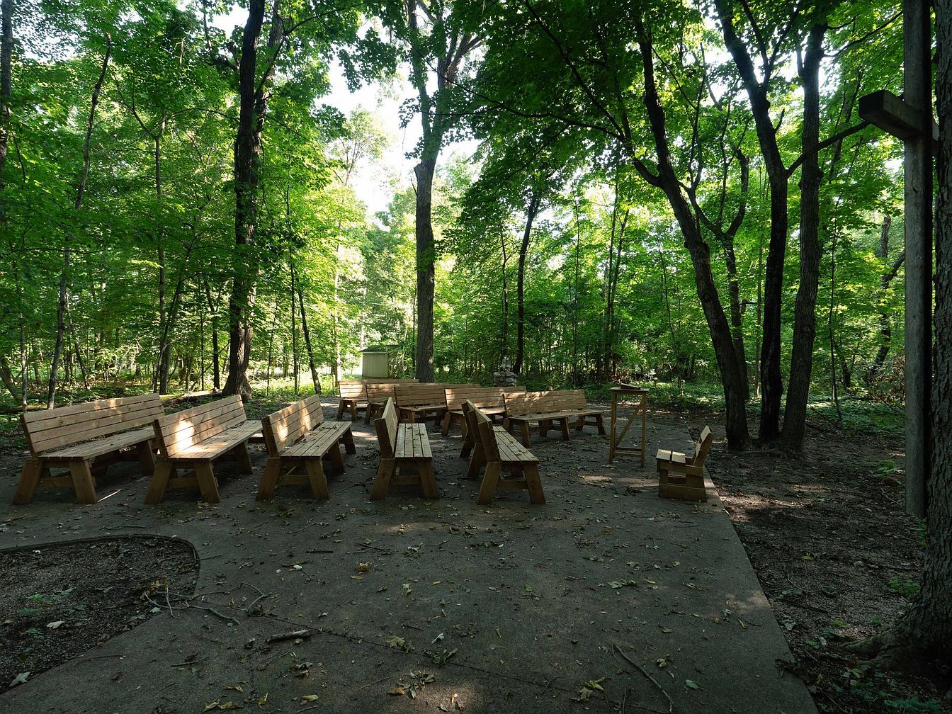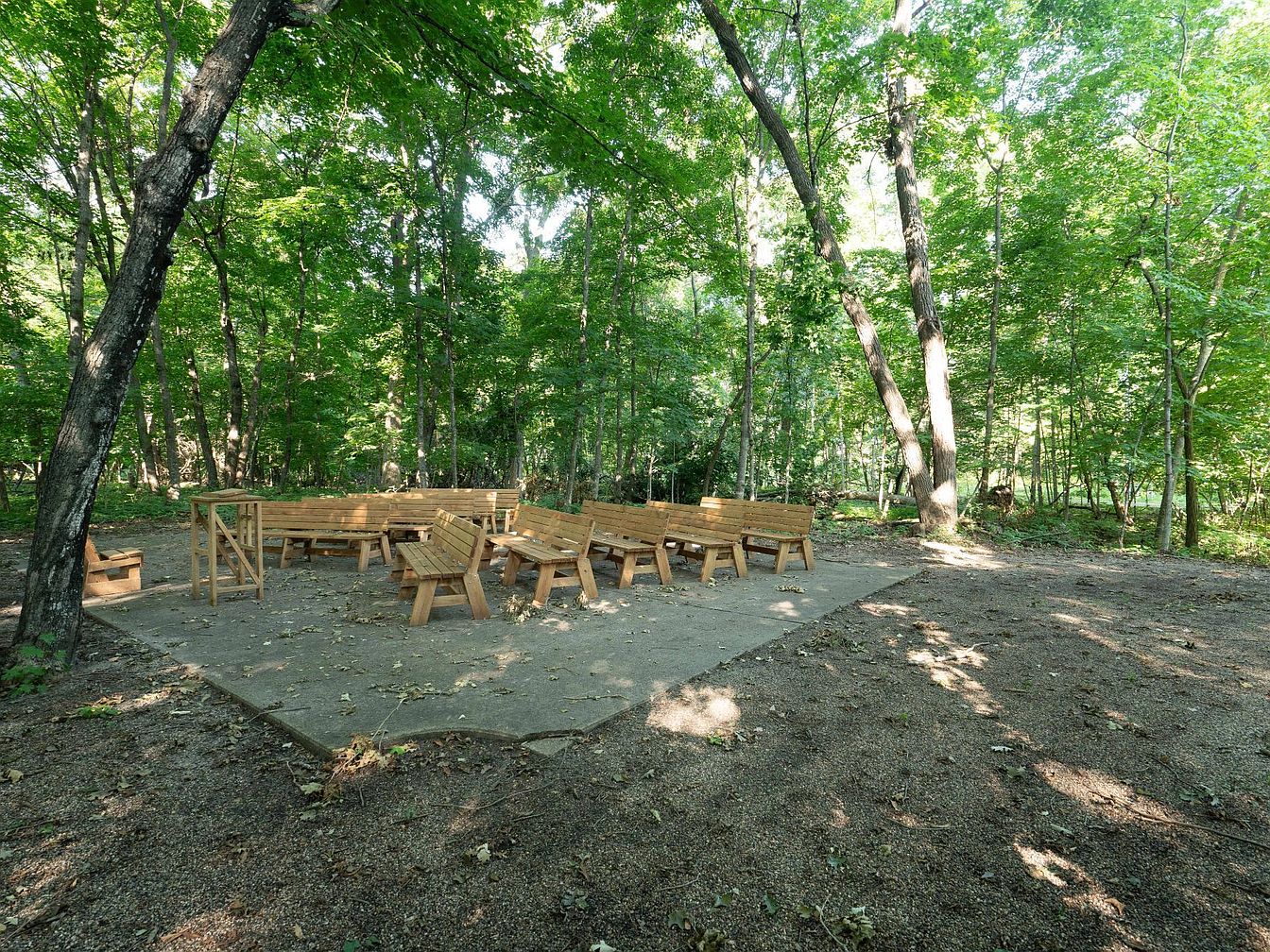 A serene outdoor space nestled within a lush green wooded area, featuring multiple sturdy wooden benches arranged on a concrete patio. The benches are organized in small clusters, creating a welcoming and functional area for group activities or family gatherings. Tall trees provide ample shade, filtering natural sunlight for a comfortable environment. The surrounding forest delivers a peaceful ambiance, ideal for children to explore and families to enjoy outdoor activities together. The natural color palette of wood and greenery, along with the open-air setting, fosters a relaxing, family-friendly atmosphere perfect for socializing or quiet reflection amid nature.