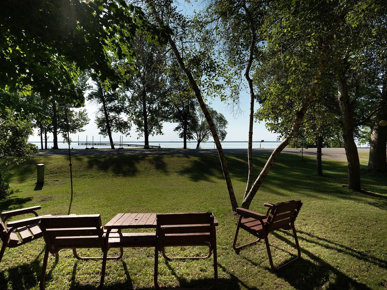 A tranquil backyard features a cluster of sturdy wooden chairs and a table arranged under the shade of mature leafy trees, creating a welcoming spot for outdoor family gatherings or children’s play. The green lawn stretches toward the edge of a peaceful waterfront, offering unobstructed views of a serene lake framed by the silhouettes of tall trees and a wooden dock in the distance. Natural sunlight filters through the branches, casting playful patterns of shade on the grass. This area is ideal for families as there is ample open space for outdoor games, picnics, and safe relaxation in a private, nature-infused setting.