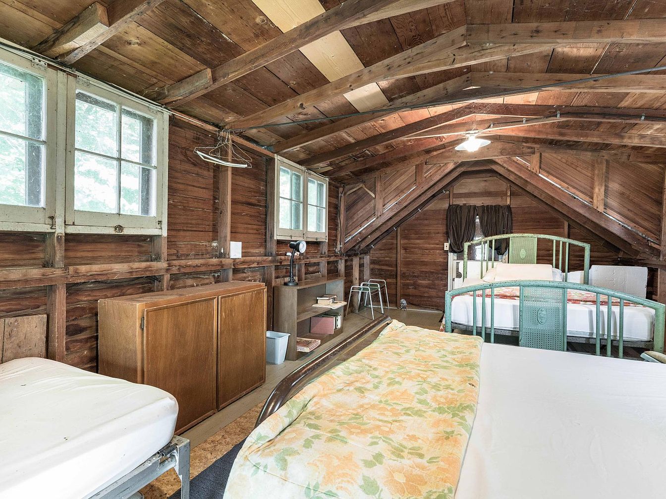 This inviting bedroom loft features exposed wooden beams and walls, creating a cozy, rustic atmosphere ideal for a family retreat. The space is spacious and open, allowing for multiple beds, perfect for siblings or guests, fostering closeness and comfort. Large windows line one side, letting in soft natural light and providing a view of surrounding greenery. The decor is minimal with functional vintage-style cabinetry and twin beds with light green metal frames. The neutral wood tones are complemented by pastel bedding, adding warmth and a touch of charm. Functional details like a lamp and side tables complete the family-friendly setting.