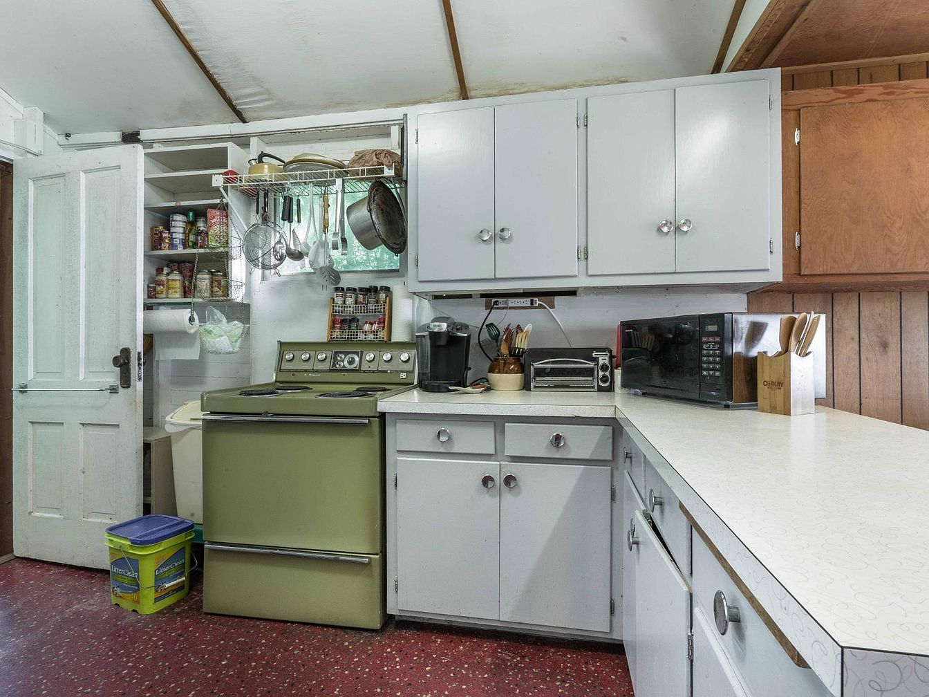A spacious kitchen area featuring a vintage olive-green stovetop and oven, surrounded by white cabinetry with chrome handles. The creamy white countertop offers ample workspace for meal prep and gathering, making it ideal for family cooking. A variety of small appliances, including a toaster, microwave, and coffee maker, are neatly arranged on the counters, maximizing functionality. Open shelving and a pantry closet store an assortment of canned goods and spices, ensuring easy access for busy families. Natural light filters in through a small window above the stove, while warm wooden paneling and red speckled flooring add a cozy, welcoming feel to the room.