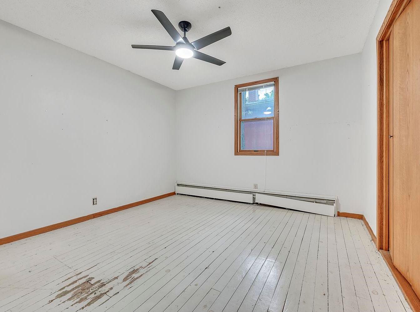 A simple, empty bedroom with a distinctly minimal aesthetic. The faded white wooden floorboards have visible scratches and stains, contributing a rustic, lived-in feel. The walls are painted a soft, neutral white and are unadorned. There is a large closet with wooden sliding doors on the right side. A single wood-framed window allows natural light to enter, casting subtle shadows in the room. The black modern ceiling fan and central light fixture give a touch of contemporary style while the baseboard heater under the window hints at the home’s age. The room feels clean, spacious, and ready for customization.