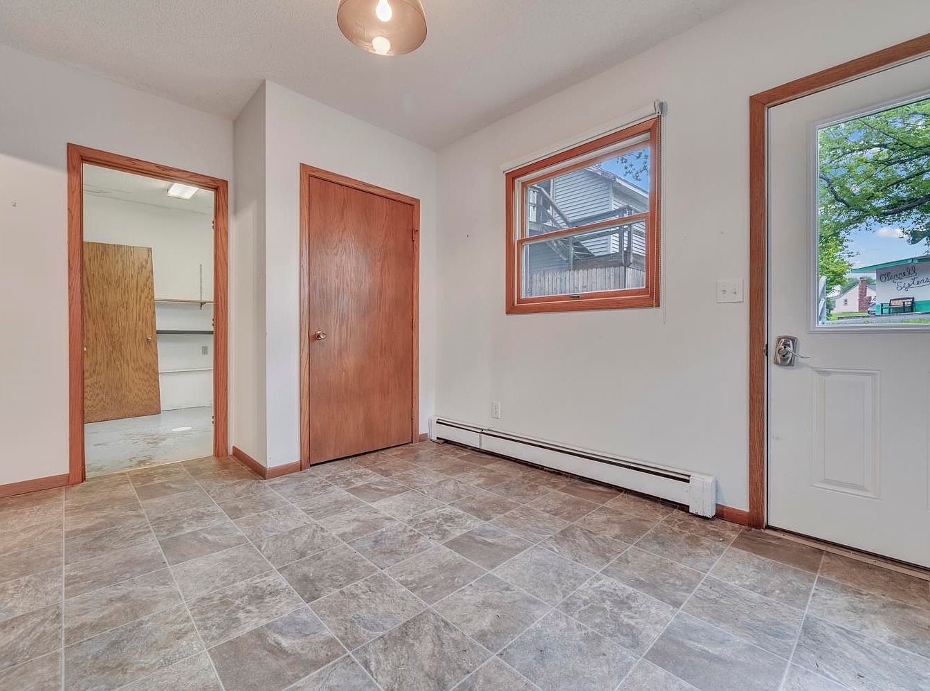Neutral, uncluttered space with stone-look tile flooring and white walls framed by medium-tone wood trim, creating a clean, practical aesthetic. To the left, a door opens to a utility or storage area featuring bright lighting and simple shelving. The main area includes a wood panel door likely leading to a closet, while a single-pane window and adjacent white exterior door offer views outside. Natural light fills the room, and a compact baseboard heater lines the wall, contributing to functionality and comfort. The understated ceiling light adds to the room’s practical, straightforward design, making this a sensible entry or transition area.