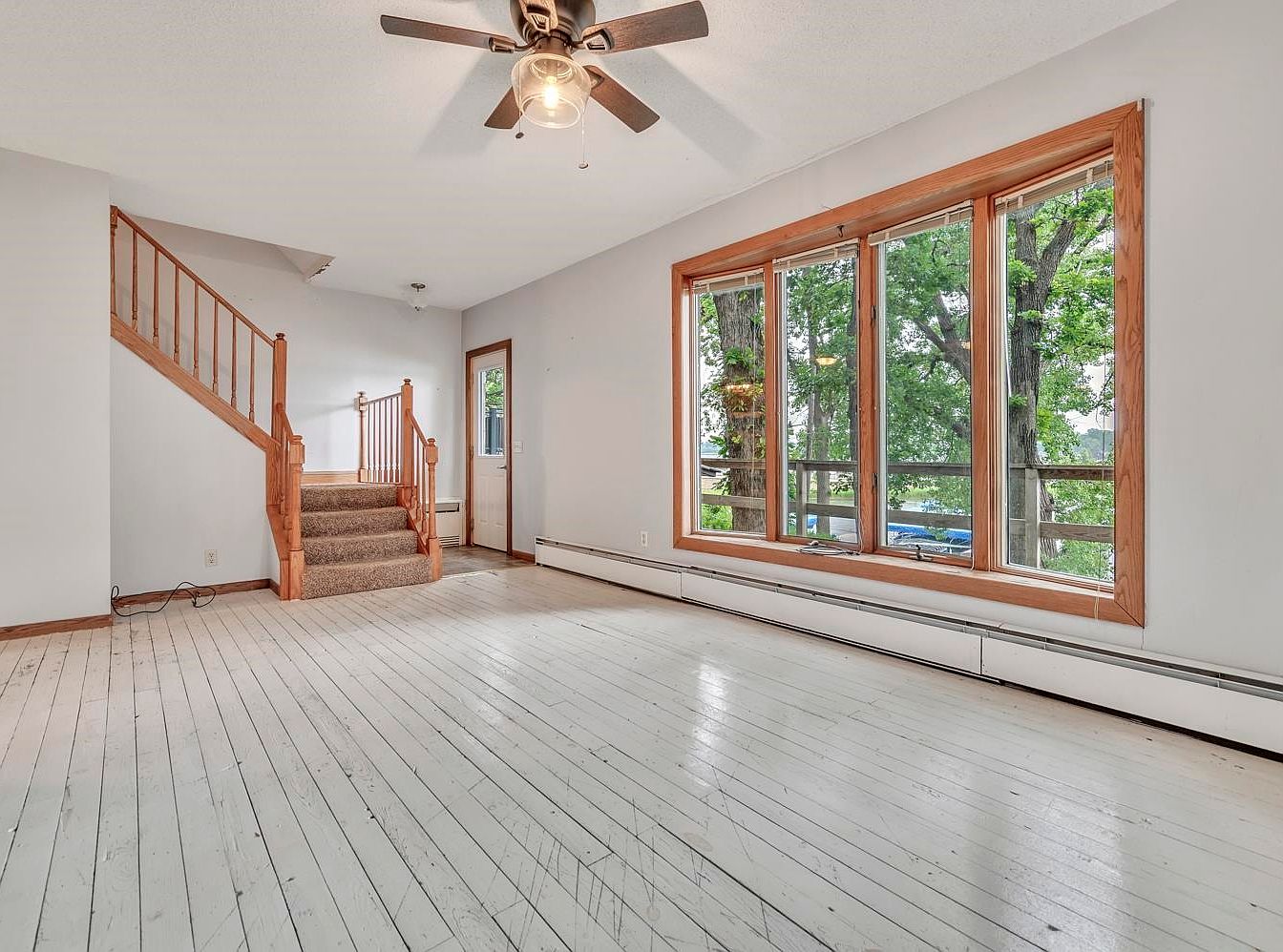 A spacious living room with a rustic feel, featuring whitewashed wooden plank floors with visible wear and character. The focal point is a large bank of windows with warm wood trim, allowing abundant natural light and providing a clear view of mature green trees outside. The room is painted a soft, neutral gray, complemented by matching wood trim along the baseboards. A simple wooden staircase with a carpeted runner leads upward along one side, adjacent to a door that suggests access to another area or outdoors. An overhead ceiling fan with a glass light fixture adds functional charm.