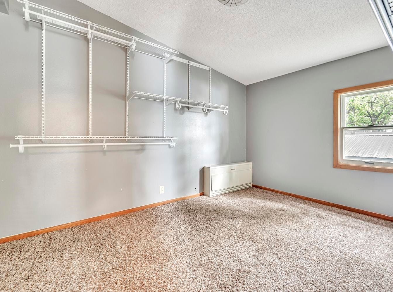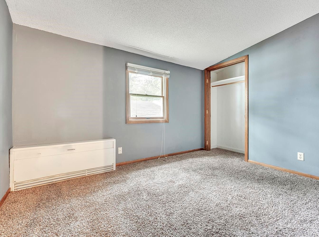 A modest bedroom with light gray and blue painted walls offset by a medium wood trim. A window with a wooden frame draws daylight into the room, its blinds partially raised, offering a view of greenery outside. Below the window is a white baseboard heater. The room features thick, speckled beige carpeting for a cozy feel. On the right side is an open closet with a simple wooden border and a high shelf. The ceiling is textured white, adding visual interest, while multiple electrical outlets are visible along the baseboards, allowing for flexible furniture arrangements.