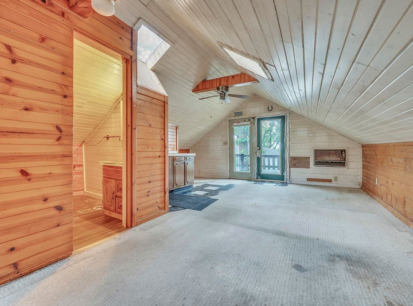 A spacious attic room with angled ceilings finished in light-stained wood planks, offering a warm and rustic atmosphere. Natural light streams in through two skylights and a set of glass double doors leading to a balcony, framed by teal-painted trim. To the left, an open doorway reveals a small adjoining bathroom with matching woodwork. A ceiling fan is mounted centrally, beneath the peak of the roof, while a small gas wall heater is positioned on the right wall. The carpeted floor shows some wear, and built-in cabinetry provides practical storage beneath the sloped ceiling.