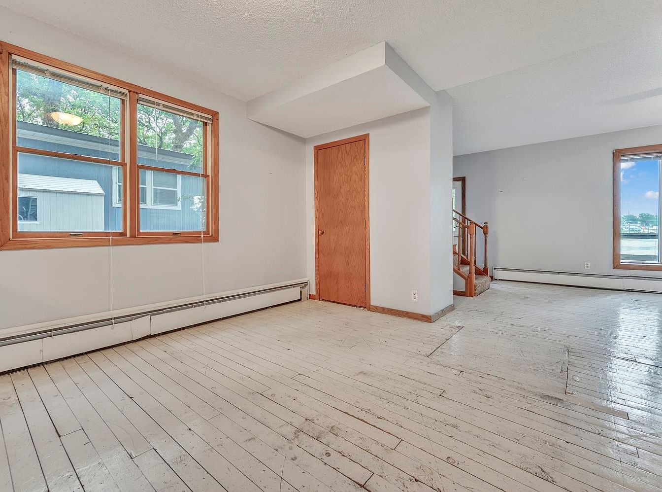 A spacious living area with a rustic, weathered white wooden floor that adds character and a sense of history to the space. The walls are painted a soft, light gray, providing a neutral backdrop that enhances the room’s brightness. Two large windows with natural wood trim let in abundant natural light and offer a view of the outdoors. In the corner, a wooden door, matching the trims, provides access to a storage area or closet. Radiator baseboard heating lines the perimeter. To the right, a partial wall borders the open stairwell, adding architectural interest while maintaining an open flow.