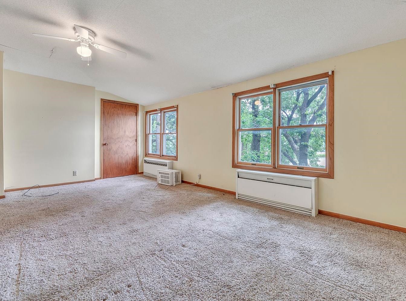 Spacious bedroom filled with natural light from two large windows and an additional window on the adjacent wall, framed in wood for a classic touch. The walls are painted a soft cream, enhancing the sense of openness. The floor features plush beige carpeting that adds warmth and comfort. A ceiling fan, painted white, provides ventilation overhead. The room contains two white baseboard radiators and minimal furniture or decor, creating a simple, uncluttered aesthetic. The wooden door, likely leading to a closet or hallway, matches the window frames and trim, adding to the cohesive and understated vintage style.