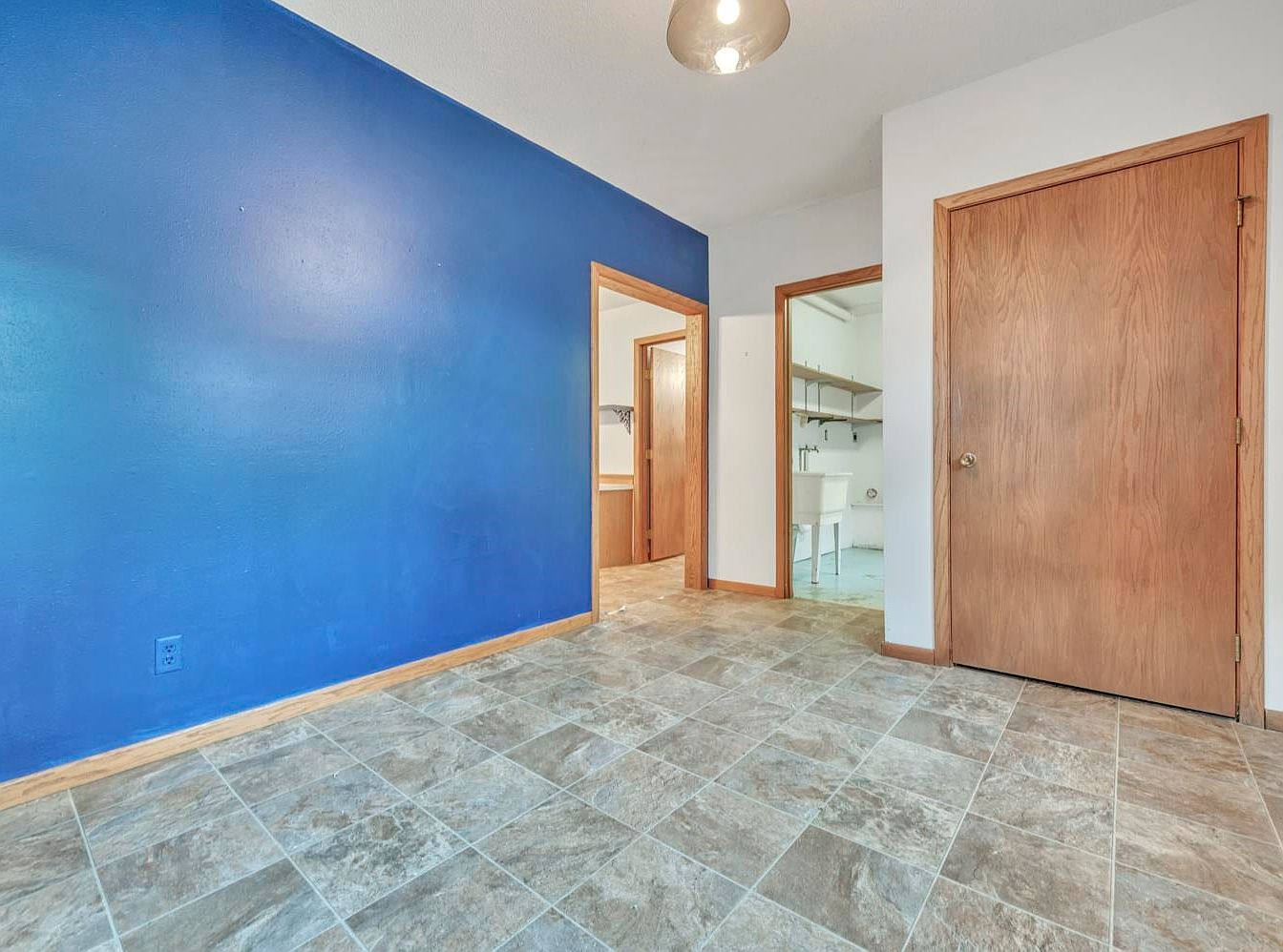 A small, functional room featuring a bold cobalt blue accent wall paired with neutral white on the remaining walls. The floor is covered in gray and beige ceramic tiles with a stone-like pattern, adding durability and visual interest. Wooden trim lines the baseboards, door frames, and two prominent wooden doors, one perhaps leading to storage or a utility closet. Two open doorways reveal adjacent rooms; one contains a white utility sink and visible shelving, suggesting a laundry or mudroom. The ceiling is white with a simple, dome-shaped light fixture providing ample illumination for the space.