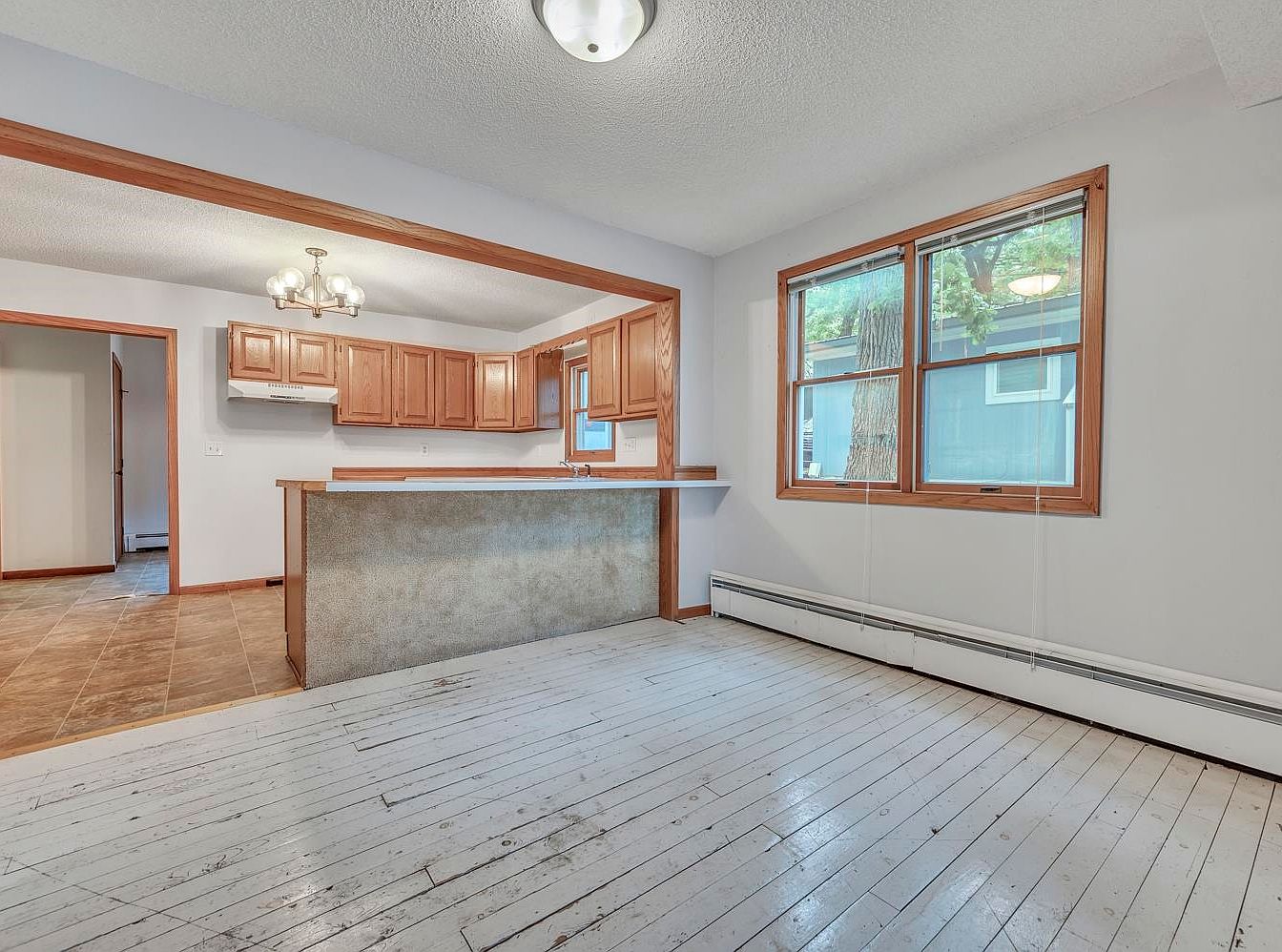 A spacious area featuring an open layout between kitchen and dining space. The kitchen has light wood cabinetry along two walls and matching wood trim around doorways and windows. The countertop extends in a peninsula with a worn, light-colored front. The dining area floor is painted wood with visible wear marks, contrasting the kitchen’s tile flooring. Large windows bring in natural light and provide views of the outdoors, framed by natural wood that complements the cabinetry. Light gray walls, baseboard heating, and ceiling-mounted light fixtures complete the clean, simple, and functional aesthetic.
