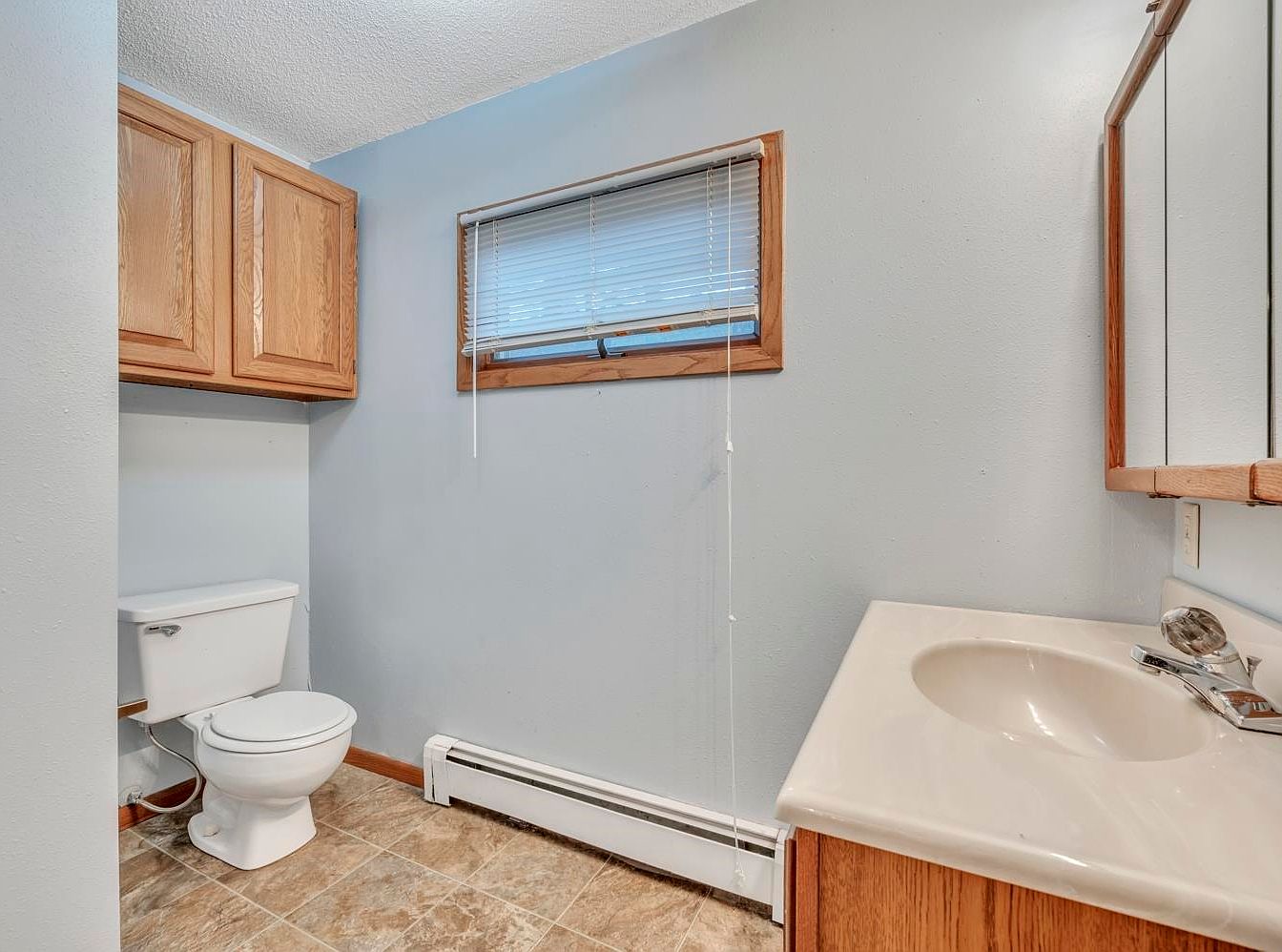 A compact bathroom features a simple and tidy design with light blue walls, a neutral tile floor, and a white toilet positioned in the corner. Above the toilet, natural wood cabinetry provides storage, matching the wooden trim around the small rectangular window. The window, fitted with white blinds, lets in soft daylight, complementing the overall brightness. Adjacent to the toilet, the vanity has an off-white countertop with an integrated sink and chrome faucet, along with a mirror-front wood medicine cabinet above. The space is clean and functional, with subtle contrasts created by wood accents against cool, light hues.