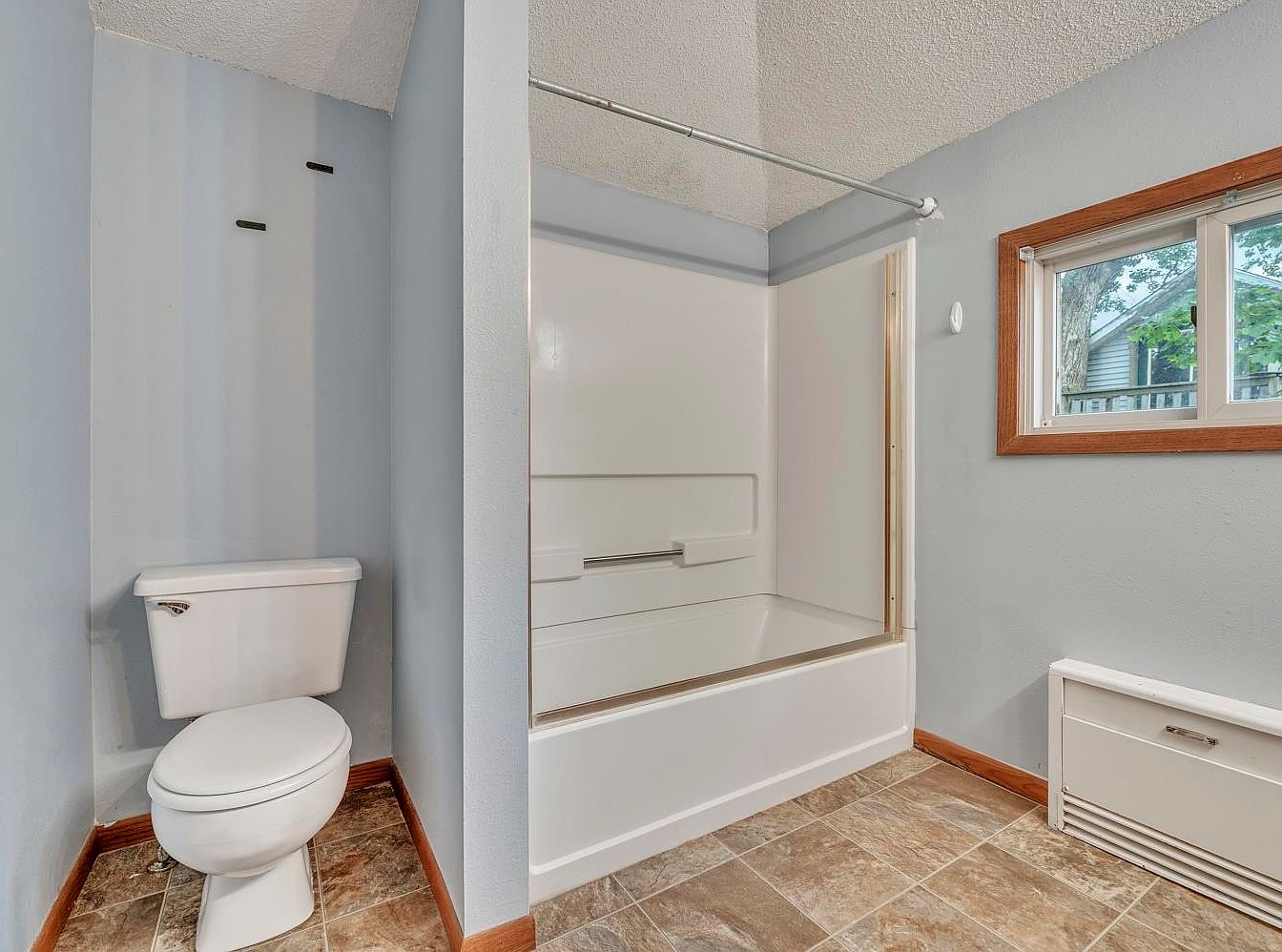 A simple bathroom features a white toilet in the left corner and a combination bathtub-shower with integrated shelving on the right, separated by a partial dividing wall. The walls are painted a soft gray-blue, contrasting with the warm wood trim around the window and baseboards. Large rectangular floor tiles display earth-toned patterns, adding subtle warmth to the space. A single window allows natural light to filter in, showcasing a glimpse of greenery outside. Minimalistic and practical, the room feels clean and airy, with a mix of modern and functional design elements.