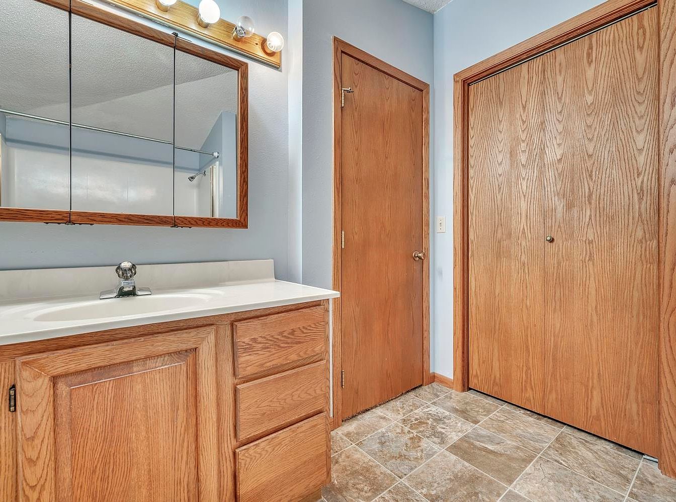 A spacious bathroom area featuring a large wooden vanity cabinet with a white countertop and built-in sink. Above the sink is a wide mirror framed in matching wood, with four globe vanity lights mounted above it on a wood strip. The walls are painted a light, calming blue. Two doors, made of similar natural wood as the vanity, are situated on adjacent walls—one is a standard door and the other appears to be a double closet door. Grey and tan tile flooring provides a durable, easy-to-clean surface that complements the room’s earth-toned wood accents and soft wall color.