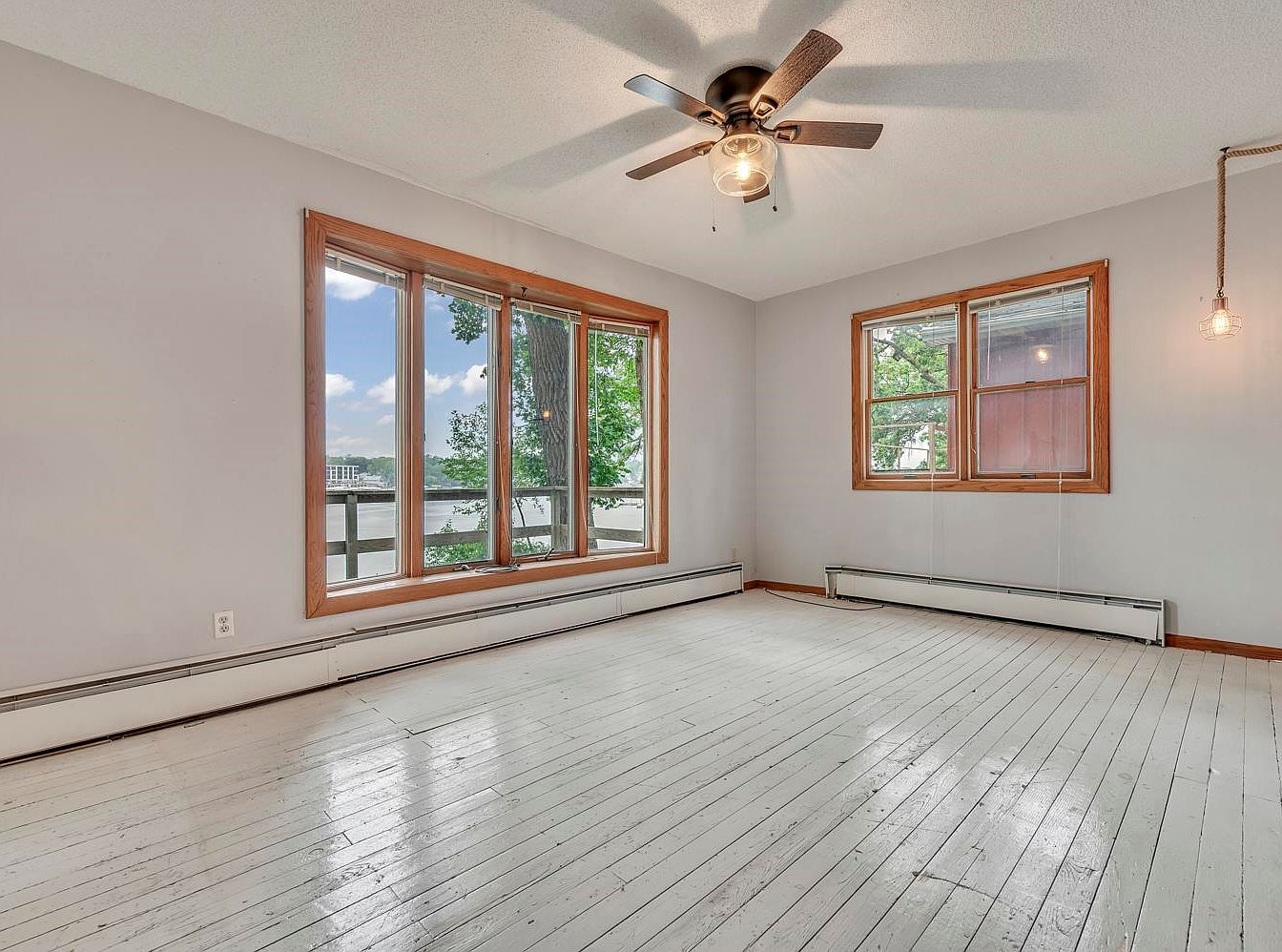 Expansive windows framed in natural wood offer panoramic views of a lake and lush trees, filling the space with natural light. Pale gray walls create a fresh, airy atmosphere, complemented by white-painted hardwood floors that bring a vintage, rustic charm. A ceiling fan with wood-toned blades and a central light fixture adds a touch of modernity and comfort overhead. Baseboard heaters line the lower wall edges, providing practical warmth. The simple, neutral palette and minimal ornamentation allow for versatile decorating, while the connection to outdoor scenery establishes a sense of tranquility and openness in the room.