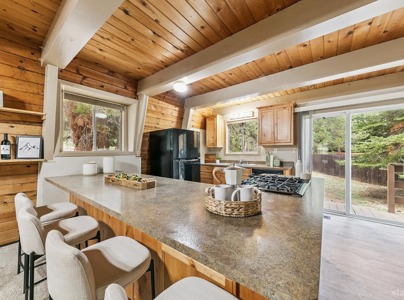 Warm wood paneling and exposed beams create a cozy, rustic charm in this spacious kitchen. A large L-shaped countertop, with plush, light-colored barstools, offers ample seating for family and guests, encouraging togetherness during meals or casual conversation. Natural light streams in through two large windows and a sliding glass door that opens to a backyard, perfect for families who love indoor-outdoor living. The kitchen combines practical elements like a black refrigerator, gas stove, and abundant wood cabinetry. Thoughtful open shelving and simple decorative touches add personality, while the neutral palette keeps the atmosphere inviting for all ages.