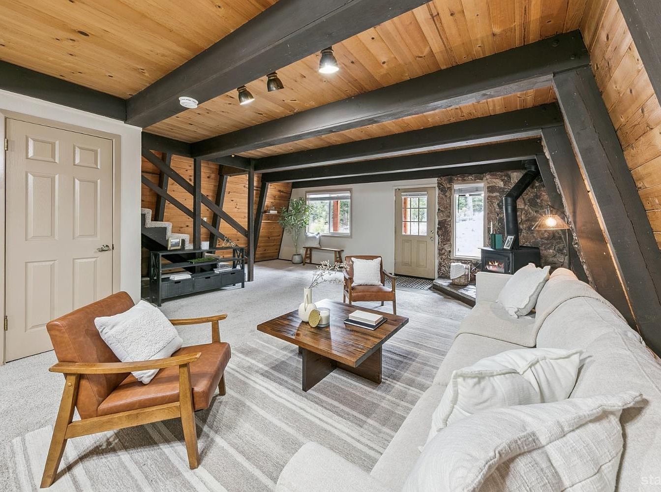 Spacious living room with rustic charm, highlighted by exposed wood beams and natural wood-paneled walls and ceiling. The space features a plush sectional sofa and two leather armchairs arranged around a simple wooden coffee table atop a modern gray-striped area rug. Natural light pours in through large windows, and a wood-burning stove with a stone backdrop creates a warm, inviting centerpiece, perfect for family gatherings. Neutral tones throughout complement the warm wood accents, and a staircase leads to an upper level, emphasizing functionality and openness. This family-friendly space balances contemporary comfort with classic cabin aesthetics, offering room for both relaxation and play.
