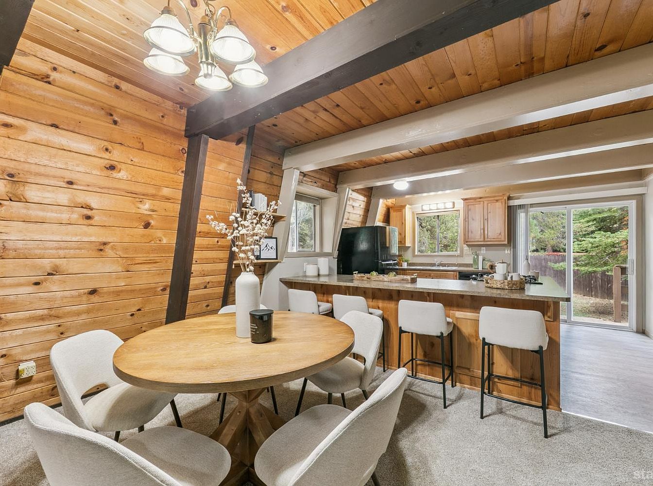 Warm wooden planks line the walls and ceiling of an open-concept space that seamlessly joins the dining area with the kitchen. The inviting atmosphere is complemented by exposed dark ceiling beams that enhance the rustic charm, while large windows and a sliding glass door offer abundant natural light and views of a lush backyard, perfect for children to play safely. The dining space features a round wooden table surrounded by plush cream upholstered chairs, and the adjacent kitchen has a spacious countertop with four modern barstools, ideal for family breakfasts. Neutral carpeting and functional, easy-to-clean flooring blend style with family-friendly practicality.
