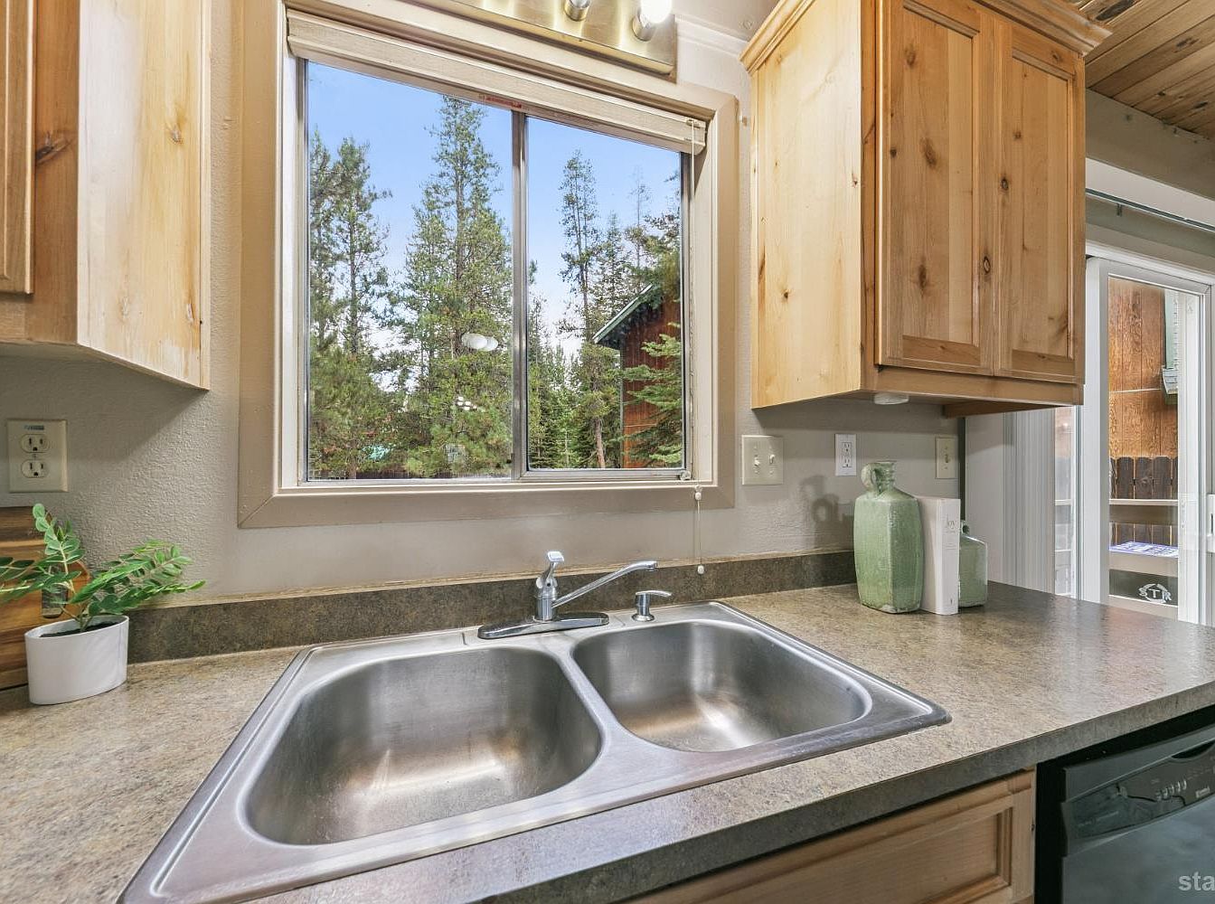 This inviting kitchen sink area features a large window that provides a scenic view of lush pine trees, bringing in plenty of natural light. The dual stainless steel sink is set into a spacious, stone-look laminate countertop, ideal for busy family routines. Warm, natural wood cabinets frame the area above and below, adding to the cozy, rustic aesthetic. Simple decorative touches, such as a small potted plant and a pair of green-tinted vases, add freshness and personality. The neutral wall color and ample counter space make it both practical and welcoming for daily cooking and cleaning needs.