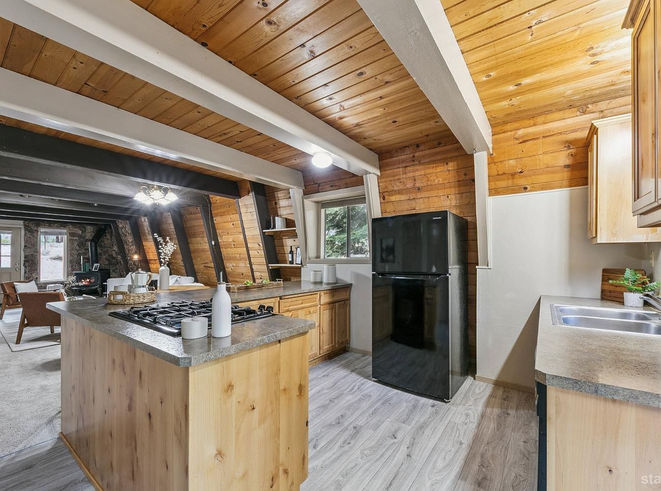 Nestled in the scenic Christmas Valley area of South Lake Tahoe, this inviting gambrel-style cabin blends historical character with modern comfort, making it ideal for family life. Built with an architectural nod to classic mountain cabins, the home offers 1,520 sq. ft. of living space on a generous 13,068 sq. ft. plot. Recent renovations include an updated kitchen with custom knotty alder cabinets, new luxury vinyl plank flooring, fresh carpet throughout, and double pane windows for year-round comfort. Enjoy gorgeous Echo Summit views and direct access to the Upper Truckee River, while National Forest lots next door guarantee privacy and recreation. Priced at $578,000, this retreat is surrounded by trails, ski resorts, and daily conveniences, perfect for both family living and vacation getaways.