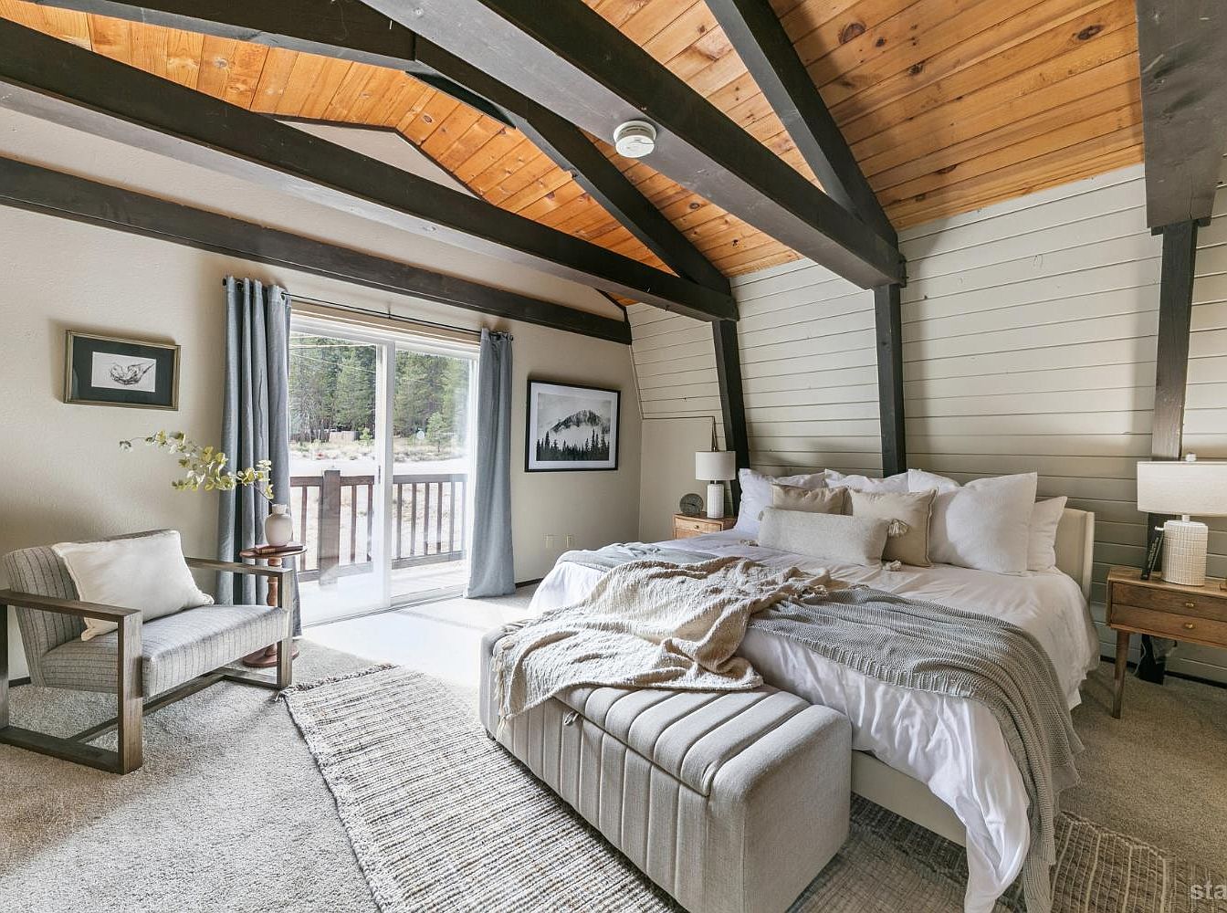Spacious bedroom featuring a vaulted ceiling with exposed dark wood beams and natural wood panels, creating a cozy, rustic ambiance. A large sliding glass door opens to a balcony, filling the room with natural light and offering a scenic view of pine trees. The soft, neutral color palette includes light gray carpets, walls, and drapes, with white bedding and a textured gray bench at the foot of the bed. A comfortable upholstered armchair sits by the door, perfect for reading or relaxing. The space feels peaceful and family-friendly; the ample floor space provides room for children to play or unwind.