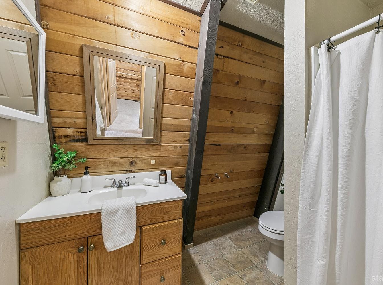 This cozy bathroom features a wood-paneled accent wall with natural tones, creating a warm and rustic ambiance. The corner vanity is crafted from medium-toned wood, topped with a durable white countertop, and complemented by modern hardware. A square wood-framed mirror hangs above, with a small houseplant adding a touch of greenery. The room is equipped with a white sink, chrome faucet, and practical storage drawers. Neutral patterned flooring enhances easy cleaning, while a white shower curtain provides privacy. The overall design offers family-friendly functionality and comfort, perfect for daily routines and children. Subtle decorative touches make the bathroom inviting and practical.