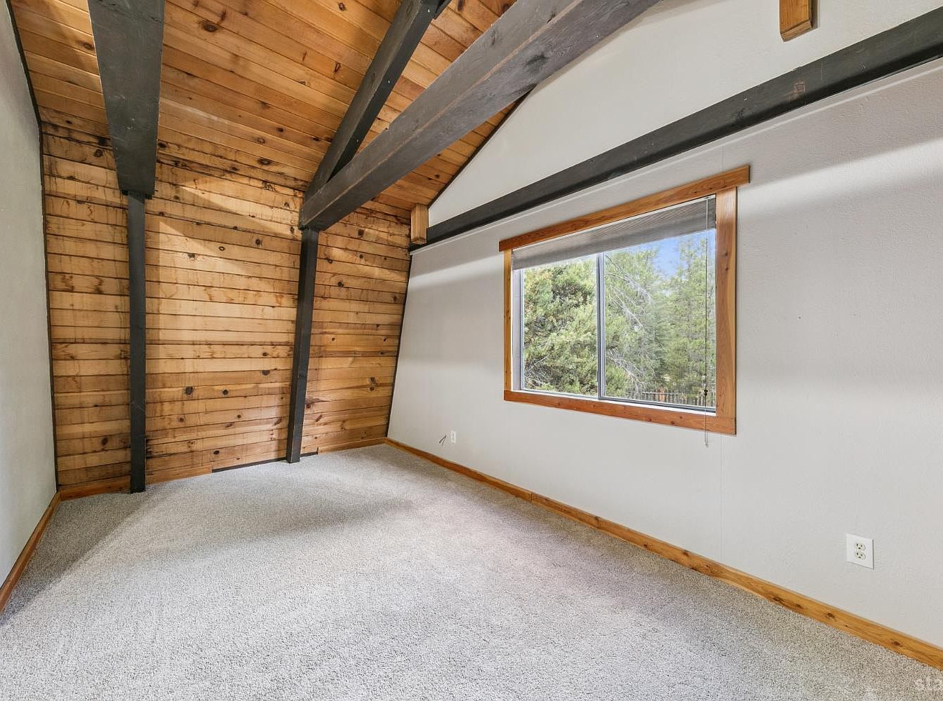 A spacious bedroom loft features a sloped wooden ceiling with bold, dark exposed beams adding architectural character to the room. The back wall is lined with horizontal pine planks, giving the space a warm, inviting cabin feel. Soft light-gray carpet stretches across the floor, providing a comfortable and safe area for children to play or relax. Large double-pane windows framed in natural wood brighten the room with ample natural light and offer scenic views of lush green trees outside, creating a calm and airy atmosphere perfect for a family. Neutral walls complement the wood tones, offering flexibility for various decoration styles.