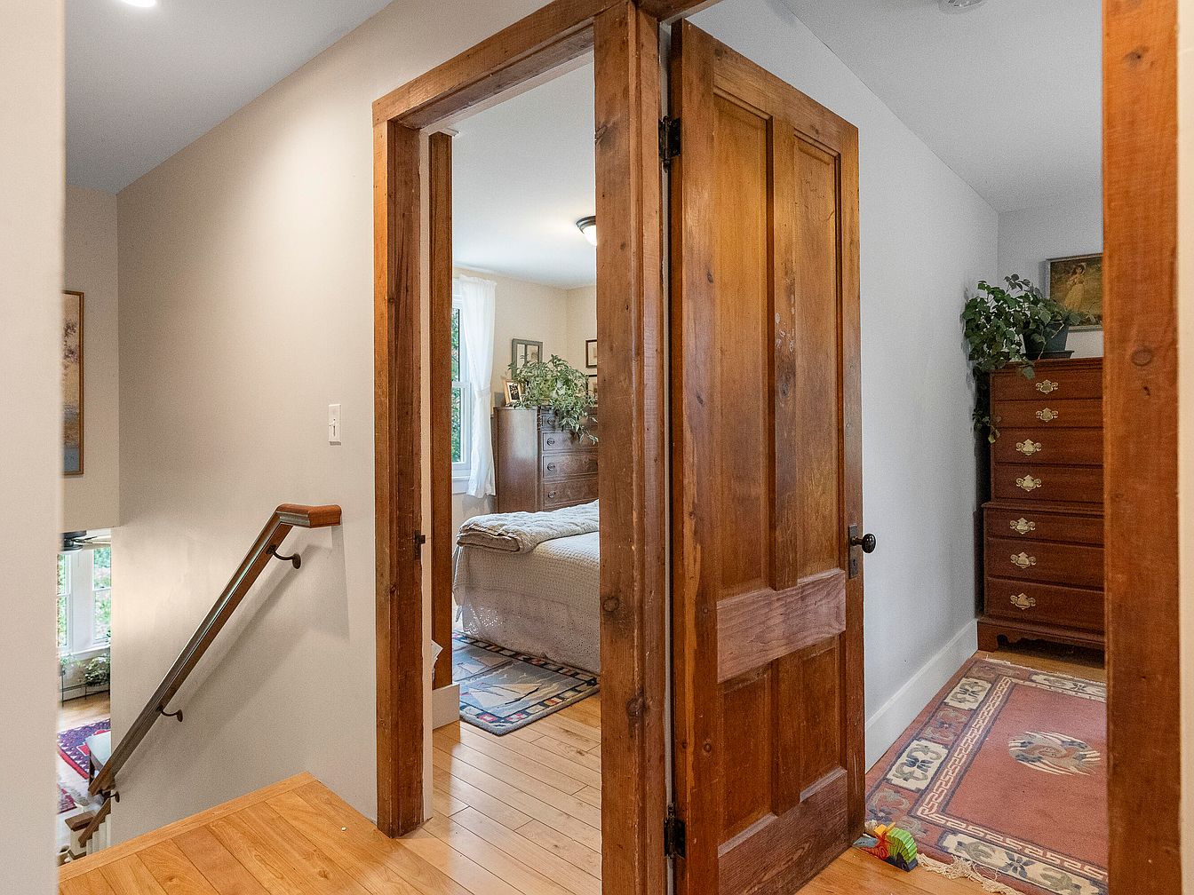 The image features a doorway leading into a cozy bedroom, framed by warm wood doors that evoke a rustic charm. The walls are painted in soft neutral tones, enhancing the inviting atmosphere. A carpet with intricate patterns adds texture beneath, while light streams through a nearby window, illuminating the room’s soothing ambiance. A dark wooden dresser stands against one wall, complemented by decorative items and a potted plant that adds a touch of greenery. The space is designed for comfort, reflecting a blend of classic and contemporary aesthetics, with simple yet elegant details that highlight its historic roots.