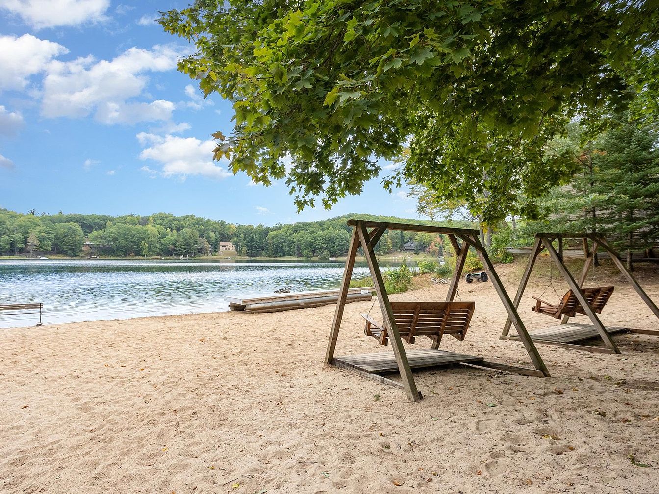 Expansive sandy beach gently slopes toward a tranquil lake, framed by lush green forests across the water. Two wooden swing benches with sturdy frames sit under the cool shade of broad-leafed trees, offering comfortable seating and a relaxing view for families. A simple wooden dock and a bench along the shoreline provide additional spots for lounging or watching children play safely in the sand. The natural color palette features warm beige from the sand, earthy tones of wood, and the vibrant greens of surrounding trees, creating a peaceful, inviting setting that encourages outdoor gatherings and safe play for all ages.