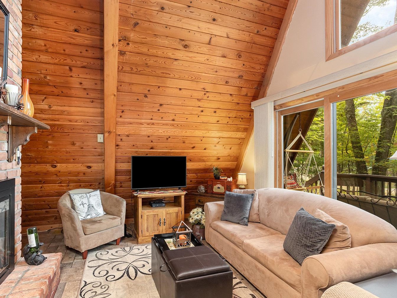 Warm and inviting living room corner featuring rustic wood-paneled walls and a high, sloped ceiling with exposed beams. A large sectional window lets in abundant natural light and offers peaceful views of the surrounding greenery, ideal for family relaxation. The room is anchored by a plush beige sofa with textured gray accent pillows, paired with a cozy armchair and a soft-patterned area rug, creating a comfortable and family-friendly space. A wooden TV stand adds to the homey touch, while a brick fireplace on the left adds both charm and a sense of coziness, perfect for gathering together on chilly evenings.