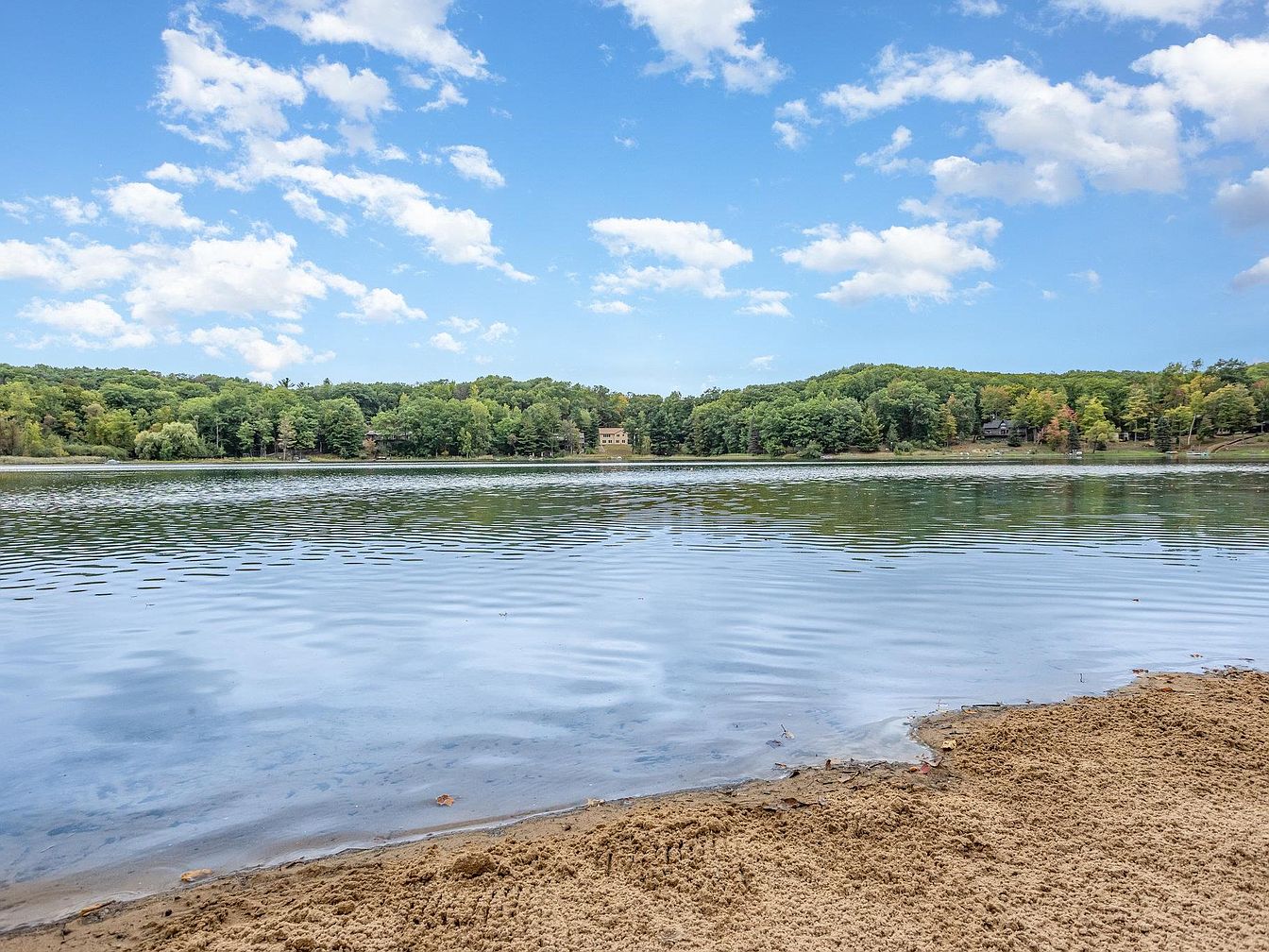 A serene family-friendly lakefront with a wide sandy shore merging gently into calm, rippling water. The sandy area offers an inviting space for children to play and families to relax by the water’s edge, perfect for picnics, sandcastles, or lakeside lounging. Across the lake, a lush line of mature trees provides a backdrop of greenery, enhancing the tranquil, nature-inspired setting. The gentle slope from the sand toward the water ensures safe entry for swimmers of all ages. Overhead, a bright blue sky with scattered, soft white clouds creates a relaxing and open atmosphere, making this a beautiful space for making memories together.