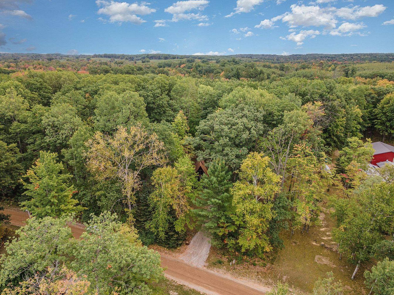 Nestled among a dense forest of mature trees, the long front driveway leads to a secluded family home, creating a peaceful and private retreat. The home is barely visible through the lush green foliage, ensuring total privacy and safety for children to play freely. The natural landscape is vibrant, with patches of autumn color beginning to emerge in the treetops. A wide dirt road passes in front, providing easy access and a rustic charm. The tranquil surroundings promise plenty of space for outdoor adventures, making it an ideal setting for families seeking connection with nature and a safe place to call home.