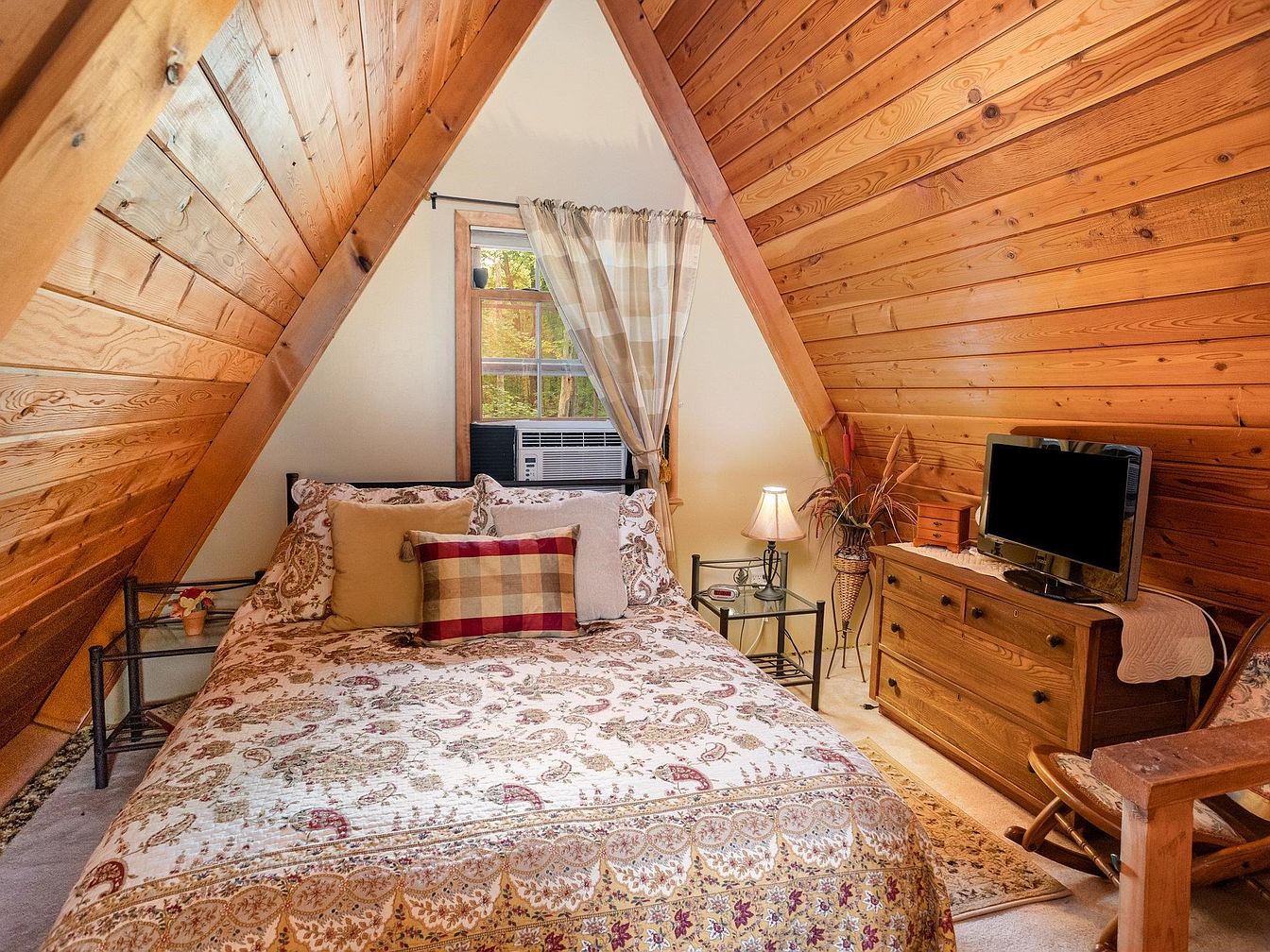 Warm wood-clad walls and ceiling shape this A-frame loft bedroom, creating a tranquil, cabin-like retreat. A queen-sized bed with a paisley-patterned comforter and assorted earth-toned throw pillows centers the space, inviting restful nights for couples or children. Natural light enters through a small window dressed with beige plaid curtains, complemented by an air conditioning unit for comfort. The dresser and bedside tables offer ample storage, perfect for family organization, while a TV adds entertainment. The area rug, houseplants, and decorative lamp bring cozy touches. The sloped ceiling enhances intimacy, making this a welcoming, secure room for any family member.
