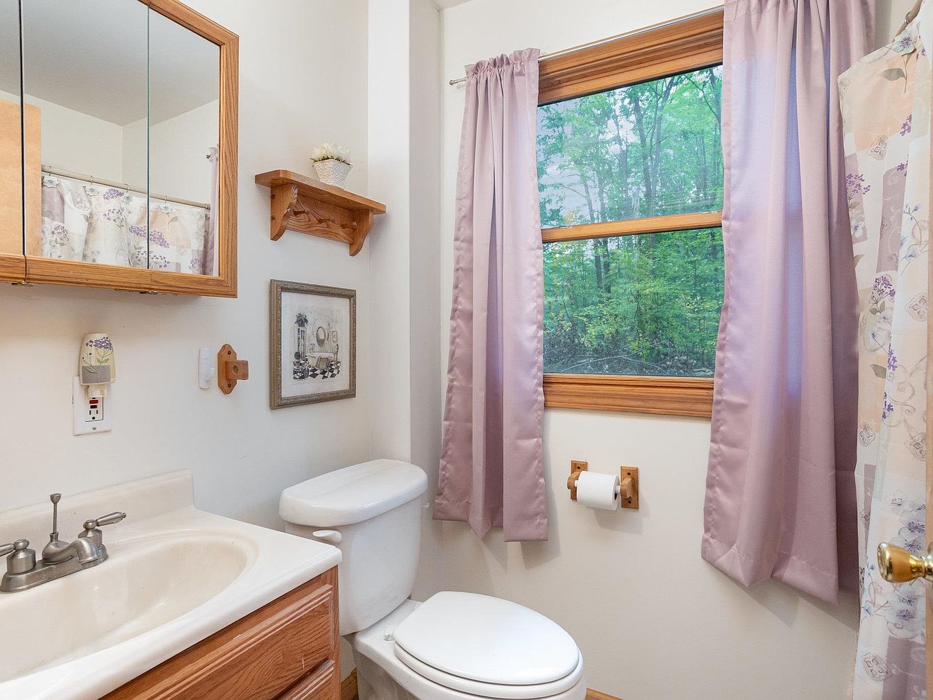 A bright and inviting bathroom with a large window dressed in light mauve curtains, framed by warm wood trim. The layout features a white porcelain sink with a wood-front vanity and brushed nickel faucet, a matching wood medicine cabinet with mirrored doors above, and a toilet beneath softly colored wall art. The shower curtain and wall decor showcase a floral theme, making the room feel cozy and welcoming. Family-friendly details include easily accessible towel racks, a sturdy wooden shelf holding a potted plant, and organized toiletry space, all set against creamy walls that enhance the gentle, peaceful color scheme.