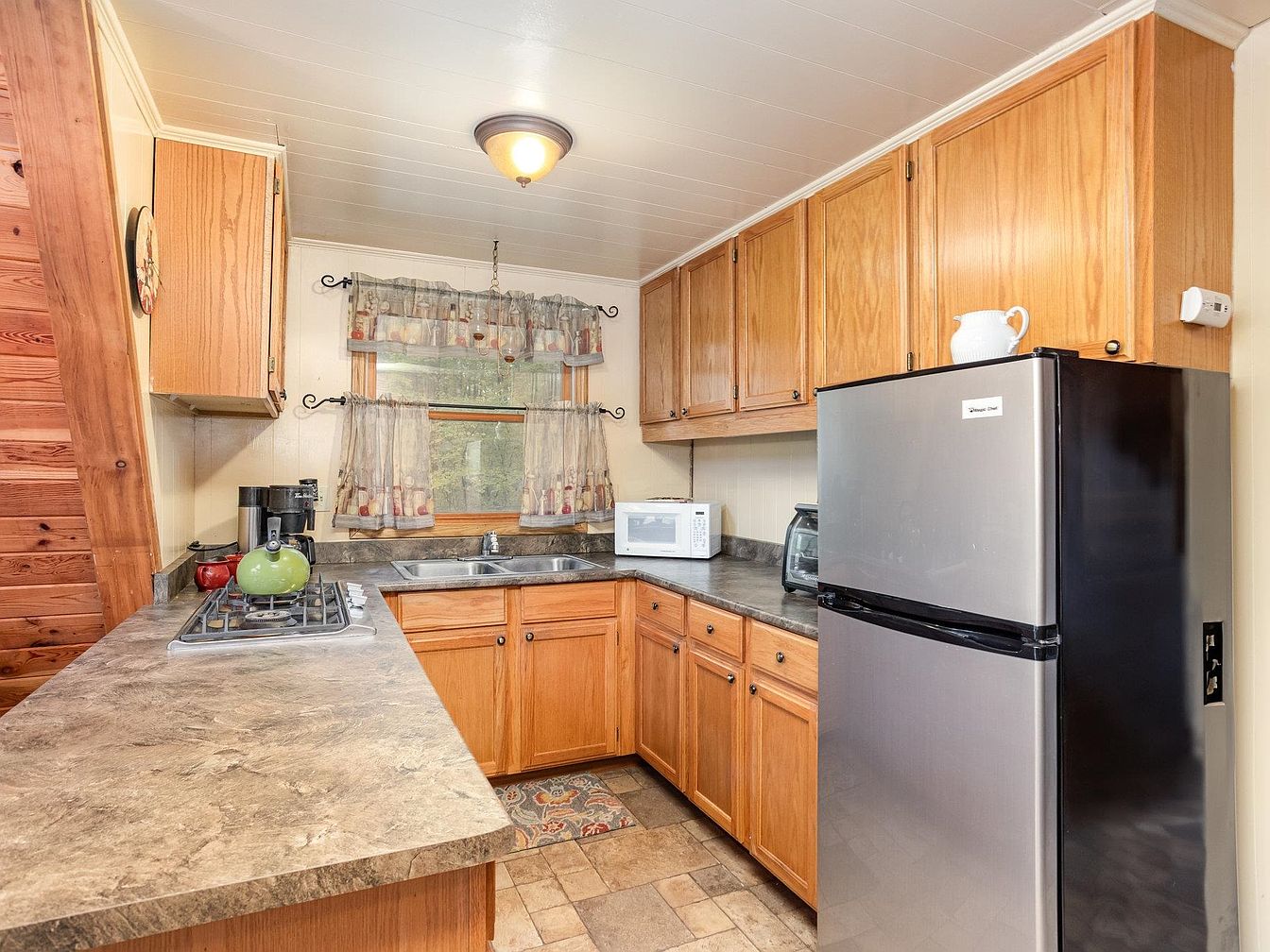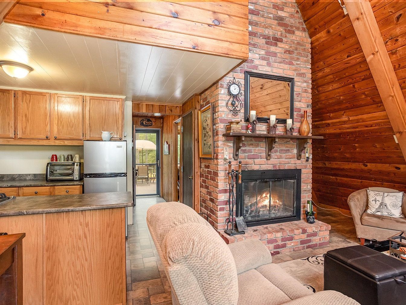 This cozy open-plan living space seamlessly combines a family-friendly kitchen and a welcoming lounge area centered around a beautiful brick fireplace. The kitchen features warm wooden cabinetry, a marble-effect countertop, stainless steel appliances, and ample storage, making it ideal for family meal prep. The living area offers plush seating perfect for relaxation, while the brick fireplace provides a natural gathering point and adds rustic charm. Natural knotty wood paneling and vaulted ceilings create a cabin-like aesthetic, fostering a comforting and homely ambiance. A sliding glass door leads to an outdoor patio, inviting natural light and extending entertaining space for all ages.