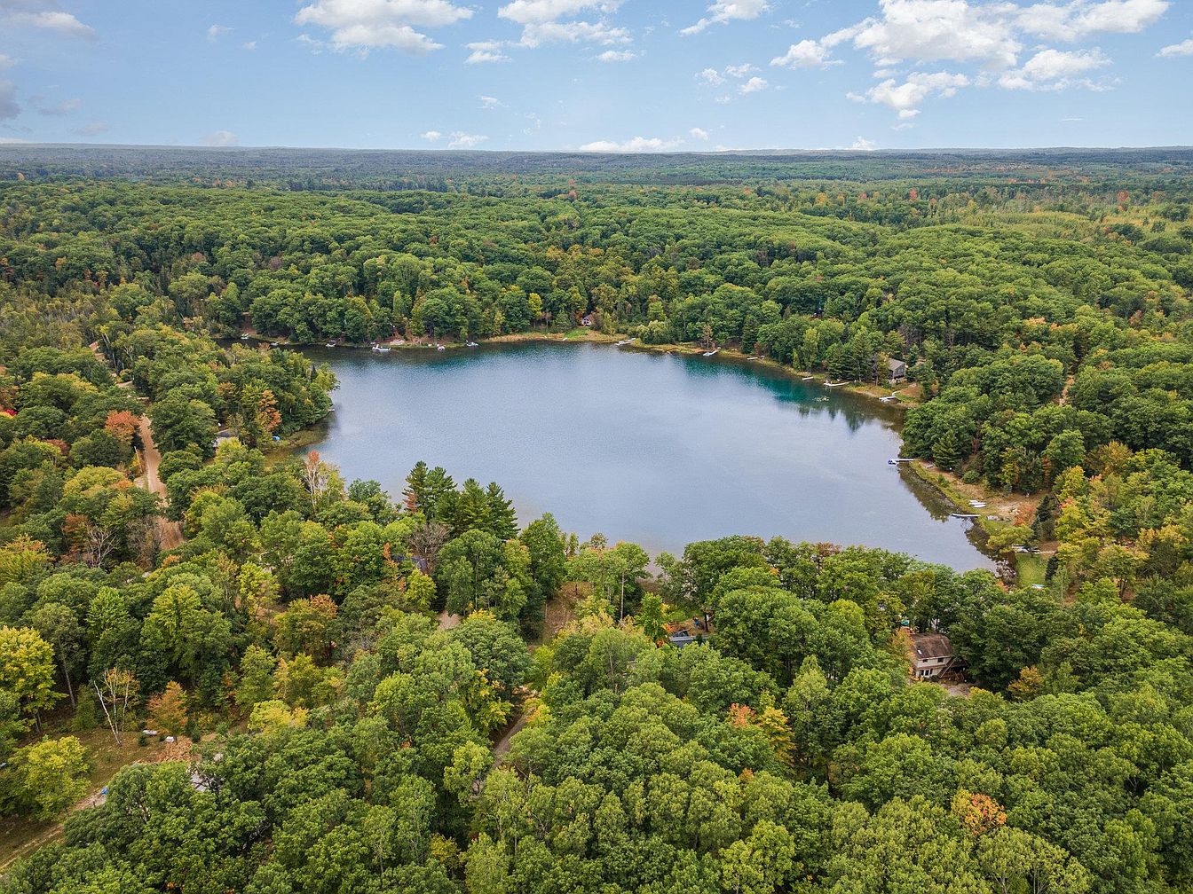 An expansive aerial view displays a vibrant, tree-filled landscape wrapped around a sparkling, peaceful lake. The shoreline is surrounded by dense, mature green forests, offering privacy and tranquility, ideal for family-friendly outdoor activities. Scattered homes nestle discreetly amid the trees, promising seclusion and safety for children to explore nature. The curving paths and access points to the water encourage swimming, boating, or picnics by the lake. The sky is bright with scattered clouds, giving the scene a cheerful atmosphere. The natural color palette includes deep greens, touches of autumnal orange, and the shimmering blue of the water, highlighting harmony with the environment.