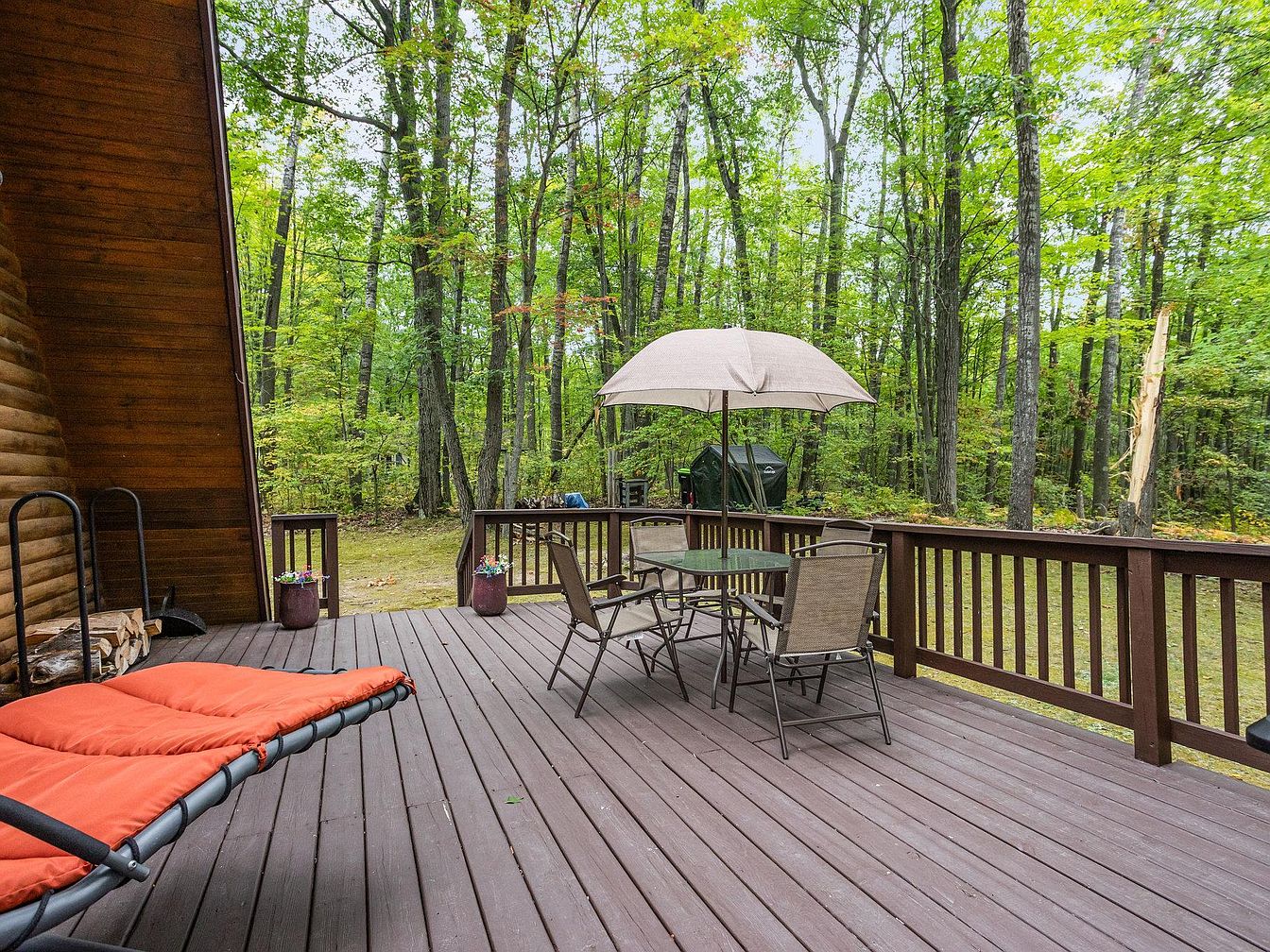 Spacious wooden deck set against a backdrop of tall green trees, creating a tranquil and private outdoor living area ideal for family gatherings. The deck features a modern outdoor dining table with four chairs and a large beige umbrella, perfect for meals or activities in the fresh air. A bright orange cushioned lounge chair offers a cozy spot for relaxation. The wood railing is complemented by planters with colorful flowers, and the clean, open layout allows for plenty of space for children to play safely. Warm brown wood tones blend naturally with the surrounding forest, emphasizing a harmonious connection to nature.