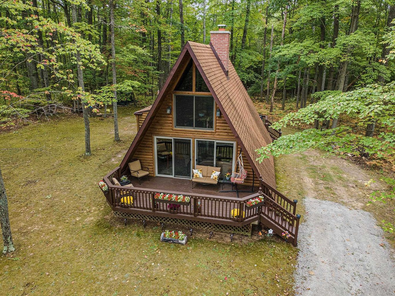 Nestled in the tranquil Blue Lake Estate of Gladwin, MI, this charming A-frame cottage offers timeless appeal and makes an ideal family retreat. With classic rustic log siding, a brick wood-burning fireplace, and a spacious main floor, it is perfect for year-round comfort and gatherings. Built for serene lake living, the home boasts a huge wraparound deck with panoramic lake views, a private backyard abutting state land, and access to exclusive estate amenities, private beach, park, and trails. Recent upgrades include a new 5″ well (2018), rebuilt chimney, refreshed gravel driveway, and refurbished forced-air furnace (2019), making maintenance a breeze. Listed at $149,900, it’s an inviting, all-season, up-north escape offering four-season family relaxation and adventure.