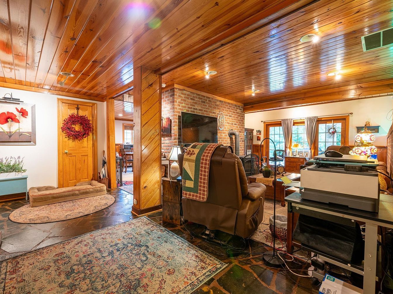 This inviting living room showcases a blend of rustic and modern elements. Rich wooden ceilings and beams create warmth, complemented by a charming brick feature wall. A plush recliner, adorned with a colorful quilt, faces a large window framed with elegant drapes, allowing natural light to flood the space. The flooring features dark slate tiles, adding a touch of elegance, while an intricate area rug adds depth and color. A small coffee table, surrounded by various decorative items, enhances the cozy feel. The room transitions into a dining area, seamlessly integrating communal spaces, perfect for gatherings.
