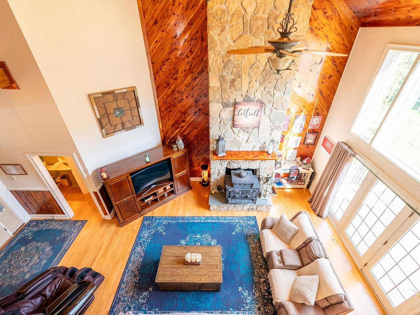This vibrant living room features a striking high ceiling adorned with rich wooden panels, creating a warm ambiance. A large stone fireplace acts as the focal point, accentuated by decorative elements including a framed sign above the mantel. A cozy seating area includes a pair of plush armchairs and a rustic coffee table. The rich blue area rug anchors the space, complementing the natural wood tones of the floors and walls. Large windows let in ample light, enhancing the airy feel. A wooden staircase leads to the upper level, adding depth and character to the overall design.