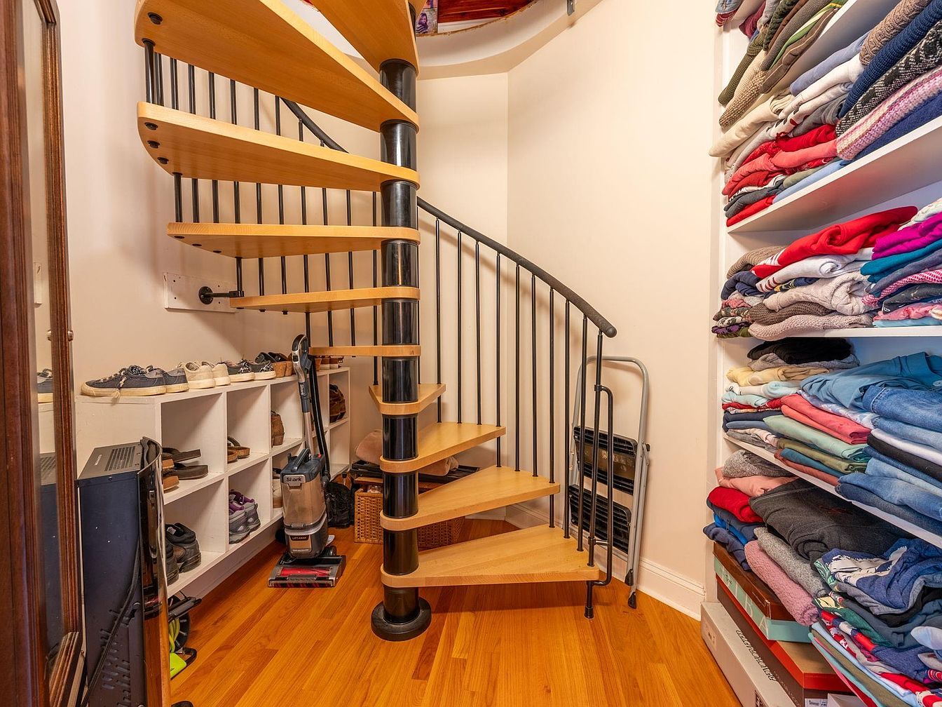 The narrow space features a sleek wooden spiral staircase with a black metal railing, creating an elegant focal point. Light natural wood contrasts against the dark metal, enhancing the contemporary aesthetic. To one side, a built-in closet showcases neatly folded sweaters and jeans in coordinated colors, emphasizing organization. Below, shoe racks contain various footwear, blending practicality with style. The warm honey-toned hardwood floor adds warmth, softening the otherwise minimalist look. A standing mirror leans against the wall, reflecting the space and creating an illusion of openness. This area reflects efficient use of space with a modern touch.