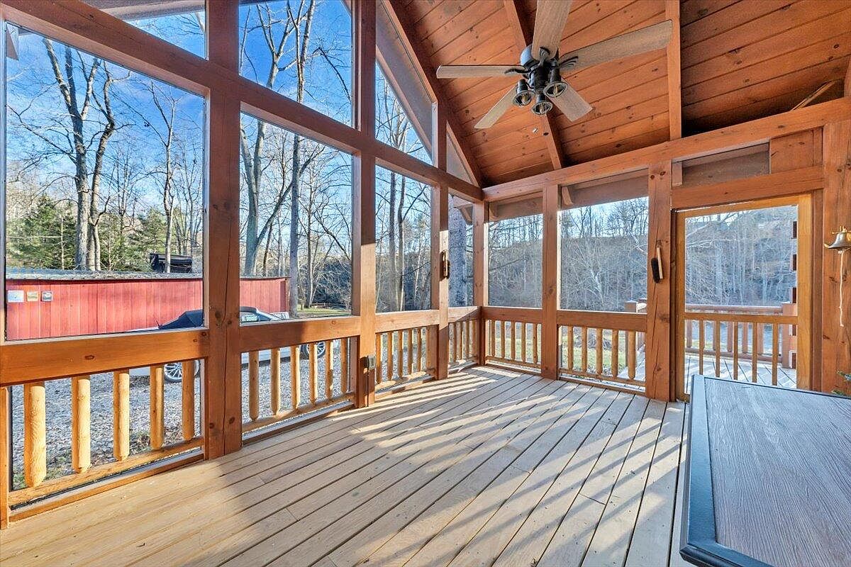 This screened porch features a warm wooden aesthetic, with rich timber walls and ceiling beams that enhance its rustic charm. A sturdy wooden floor adds character, while large windows allow for ample natural light and views of the surrounding greenery. A simple metal table is positioned against the wall, ideal for outdoor dining or relaxation. A decorative welcome sign on the wall complements the inviting atmosphere. The sloped ceiling draws the eye upward, and a ceiling fan provides comfort during warmer days. Overall, the space is designed for leisurely enjoyment, blending outdoor living with indoor comfort.